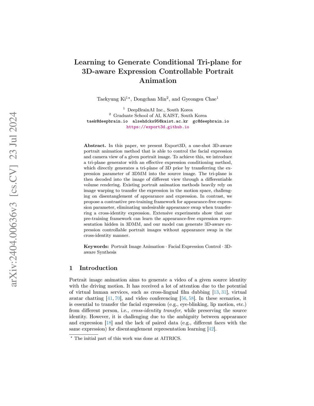 In this paper, we present Export3D, a one-shot 3D-aware portrait animation method that is able to control the facial expression and camera view of a given portrait image. To achieve this, we introduce a tri-plane generator that directly generates a tri-plane of 3D prior by transferring the expression parameter of 3DMM into the source image. The tri-plane is then decoded into the image of different view through a differentiable volume rendering. Existing portrait animation methods heavily rely on image warping to transfer the expression in the motion space, challenging on disentanglement of appearance and expression. In contrast, we propose a contrastive pre-training framework for appearance-free expression parameter, eliminating undesirable appearance swap when transferring a cross-identity expression. Extensive experiments show that our pre-training framework can learn the appearance-free expression representation hidden in 3DMM, and our model can generate 3D-aware expression controllable portrait image without appearance swap in the cross-identity manner.