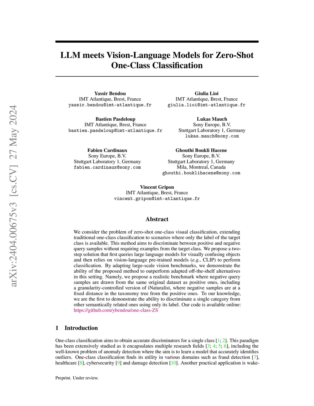 We consider the problem of zero-shot one-class visual classification, extending traditional one-class classification to scenarios where only the label of the target class is available. This method aims to discriminate between positive and negative query samples without requiring examples from the target class. We propose a two-step solution that first queries large language models for visually confusing objects and then relies on vision-language pre-trained models (e.g., CLIP) to perform classification. By adapting large-scale vision benchmarks, we demonstrate the ability of the proposed method to outperform adapted off-the-shelf alternatives in this setting. Namely, we propose a realistic benchmark where negative query samples are drawn from the same original dataset as positive ones, including a granularity-controlled version of iNaturalist, where negative samples are at a fixed distance in the taxonomy tree from the positive ones. To our knowledge, we are the first to demonstrate the ability to discriminate a single category from other semantically related ones using only its label.