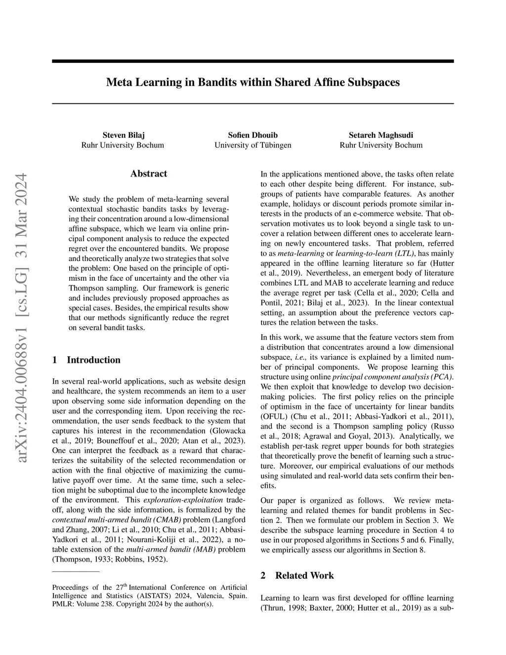 We study the problem of meta-learning several contextual stochastic bandits tasks by leveraging their concentration around a low-dimensional affine subspace, which we learn via online principal component analysis to reduce the expected regret over the encountered bandits. We propose and theoretically analyze two strategies that solve the problem: One based on the principle of optimism in the face of uncertainty and the other via Thompson sampling. Our framework is generic and includes previously proposed approaches as special cases. Besides, the empirical results show that our methods significantly reduce the regret on several bandit tasks.