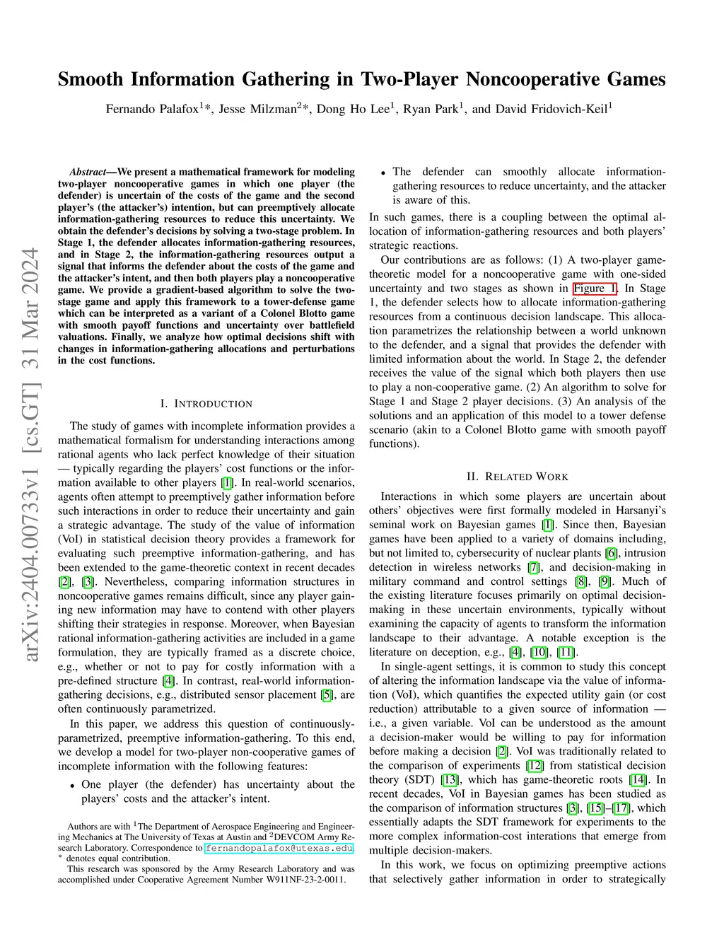 We present a mathematical framework for modeling two-player noncooperative games in which one player (the defender) is uncertain of the costs of the game and the second player's (the attacker's) intention but can preemptively allocate information-gathering resources to reduce this uncertainty. We obtain the defender's decisions by solving a two-stage problem. In Stage 1, the defender allocates information-gathering resources, and in Stage 2, the information-gathering resources output a signal that informs the defender about the costs of the game and the attacker's intent, and then both players play a noncooperative game. We provide a gradient-based algorithm to solve the two-stage game and apply this framework to a tower-defense game which can be interpreted as a variant of a Colonel Blotto game with smooth payoff functions and uncertainty over battlefield valuations. Finally, we analyze how optimal decisions shift with changes in information-gathering allocations and perturbations in the cost functions.