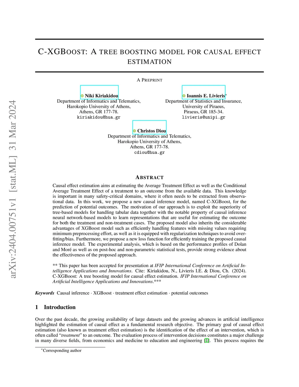 Causal effect estimation aims at estimating the Average Treatment Effect as well as the Conditional Average Treatment Effect of a treatment to an outcome from the available data. This knowledge is important in many safety-critical domains, where it often needs to be extracted from observational data. In this work, we propose a new causal inference model, named C-XGBoost, for the prediction of potential outcomes. The motivation of our approach is to exploit the superiority of tree-based models for handling tabular data together with the notable property of causal inference neural network-based models to learn representations that are useful for estimating the outcome for both the treatment and non-treatment cases. The proposed model also inherits the considerable advantages of XGBoost model such as efficiently handling features with missing values requiring minimum preprocessing effort, as well as it is equipped with regularization techniques to avoid overfitting/bias. Furthermore, we propose a new loss function for efficiently training the proposed causal inference model. The experimental analysis, which is based on the performance profiles of Dolan and Mor{\é} as well as on post-hoc and non-parametric statistical tests, provide strong evidence about the effectiveness of the proposed approach.