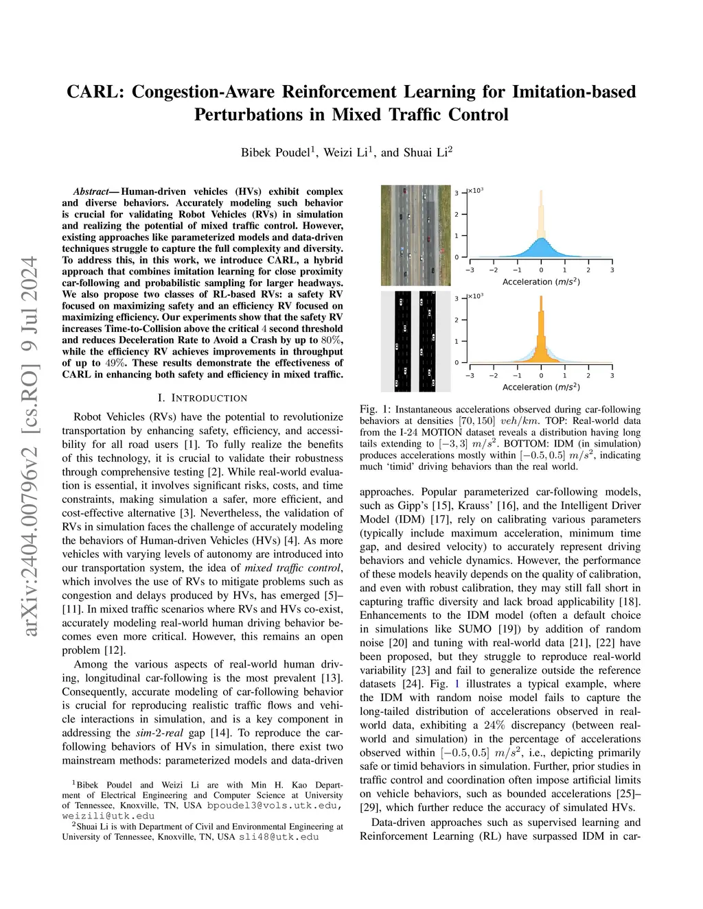 Human-driven vehicles (HVs) exhibit complex and diverse behaviors. Accurately modeling such behavior is crucial for validating Robot Vehicles (RVs) in simulation and realizing the potential of mixed traffic control. However, existing approaches like parameterized models and data-driven techniques struggle to capture the full complexity and diversity. To address this, in this work, we introduce CARL, a hybrid approach that combines imitation learning for close proximity car-following and probabilistic sampling for larger headways. We also propose two classes of RL-based RVs: a safety RV focused on maximizing safety and an efficiency RV focused on maximizing efficiency. Our experiments show that the safety RV increases Time-to-Collision above the critical 4-second threshold and reduces Deceleration Rate to Avoid a Crash by up to 80%, while the efficiency RV achieves improvements in throughput of up to 49%. These results demonstrate the effectiveness of CARL in enhancing both safety and efficiency in mixed traffic.