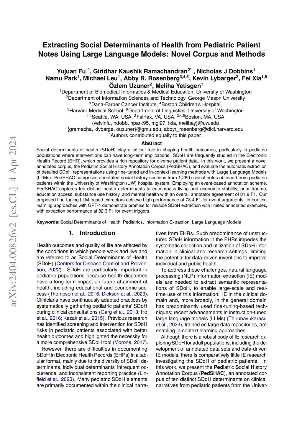 Social determinants of health (SDoH) play a critical role in shaping health outcomes, particularly in pediatric populations where interventions can have long-term implications. SDoH are frequently studied in the Electronic Health Record (EHR), which provides a rich repository for diverse patient data. In this work, we present a novel annotated corpus, the Pediatric Social History Annotation Corpus (PedSHAC), and evaluate the automatic extraction of detailed SDoH representations using fine-tuned and in-context learning methods with Large Language Models (LLMs). PedSHAC comprises annotated social history sections from 1,260 clinical notes obtained from pediatric patients within the University of Washington (UW) hospital system. Employing an event-based annotation scheme, PedSHAC captures ten distinct health determinants to encompass living and economic stability, prior trauma, education access, substance use history, and mental health with an overall annotator agreement of 81.9 F1. Our proposed fine-tuning LLM-based extractors achieve high performance at 78.4 F1 for event arguments. In-context learning approaches with GPT-4 demonstrate promise for reliable SDoH extraction with limited annotated examples, with extraction performance at 82.3 F1 for event triggers.