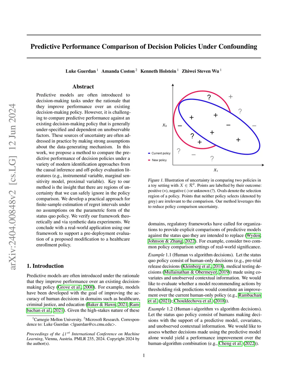 Predictive models are often introduced to decision-making tasks under the rationale that they improve performance over an existing decision-making policy. However, it is challenging to compare predictive performance against an existing decision-making policy that is generally under-specified and dependent on unobservable factors. These sources of uncertainty are often addressed in practice by making strong assumptions about the data-generating mechanism. In this work, we propose a method to compare the predictive performance of decision policies under a variety of modern identification approaches from the causal inference and off-policy evaluation literatures (e.g., instrumental variable, marginal sensitivity model, proximal variable). Key to our method is the insight that there are regions of uncertainty that we can safely ignore in the policy comparison. We develop a practical approach for finite-sample estimation of regret intervals under no assumptions on the parametric form of the status quo policy. We verify our framework theoretically and via synthetic data experiments. We conclude with a real-world application using our framework to support a pre-deployment evaluation of a proposed modification to a healthcare enrollment policy.