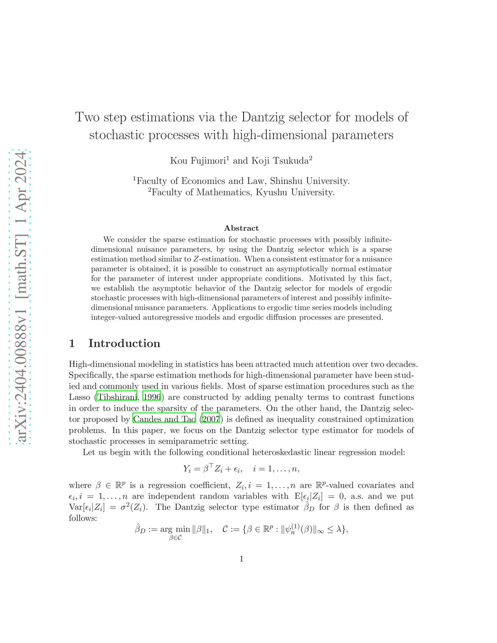 We consider the sparse estimation for stochastic processes with possibly infinite-dimensional nuisance parameters, by using the Dantzig selector which is a sparse estimation method similar to -estimation. When a consistent estimator for a nuisance parameter is obtained, it is possible to construct an asymptotically normal estimator for the parameter of interest under appropriate conditions. Motivated by this fact, we establish the asymptotic behavior of the Dantzig selector for models of ergodic stochastic processes with high-dimensional parameters of interest and possibly infinite-dimensional nuisance parameters. Applications to ergodic time series models including integer-valued autoregressive models and ergodic diffusion processes are presented.