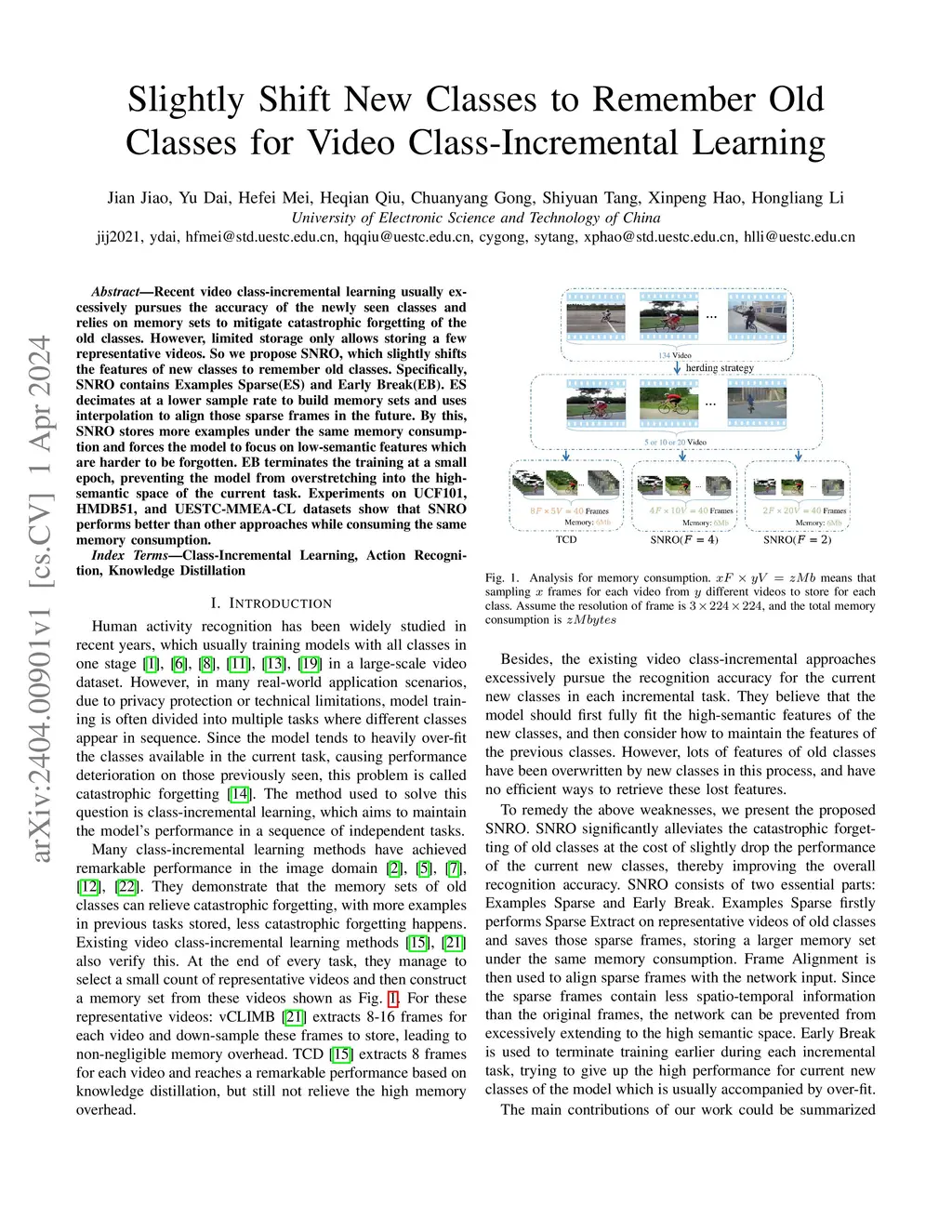 Recent video class-incremental learning usually excessively pursues the accuracy of the newly seen classes and relies on memory sets to mitigate catastrophic forgetting of the old classes. However, limited storage only allows storing a few representative videos. So we propose SNRO, which slightly shifts the features of new classes to remember old classes. Specifically, SNRO contains Examples Sparse(ES) and Early Break(EB). ES decimates at a lower sample rate to build memory sets and uses interpolation to align those sparse frames in the future. By this, SNRO stores more examples under the same memory consumption and forces the model to focus on low-semantic features which are harder to be forgotten. EB terminates the training at a small epoch, preventing the model from overstretching into the high-semantic space of the current task. Experiments on UCF101, HMDB51, and UESTC-MMEA-CL datasets show that SNRO performs better than other approaches while consuming the same memory consumption.