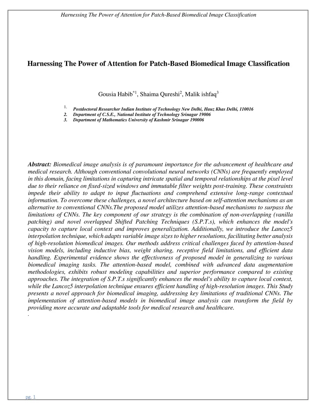 Biomedical image analysis can be facilitated by an innovative architecture rooted in self-attention mechanisms. The traditional convolutional neural network (CNN), characterized by fixed-sized windows, needs help capturing intricate spatial and temporal relations at the pixel level. The immutability of CNN filter weights post-training further restricts input fluctuations. Recognizing these limitations, we propose a new paradigm of attention-based models instead of convolutions. As an alternative to traditional CNNs, these models demonstrate robust modelling capabilities and the ability to grasp comprehensive long-range contextual information efficiently. Providing a solution to critical challenges faced by attention-based vision models such as inductive bias, weight sharing, receptive field limitations, and data handling in high resolution, our work combines non-overlapping (vanilla patching) with novel overlapped Shifted Patching Techniques (S.P.T.s) to induce local context that enhances model generalization. Moreover, we examine the novel Lancoz5 interpolation technique, which adapts variable image sizes to higher resolutions. Experimental evidence validates our model's generalization effectiveness, comparing favourably with existing approaches. Attention-based methods are particularly effective with ample data, especially when advanced data augmentation methodologies are integrated to strengthen their robustness.