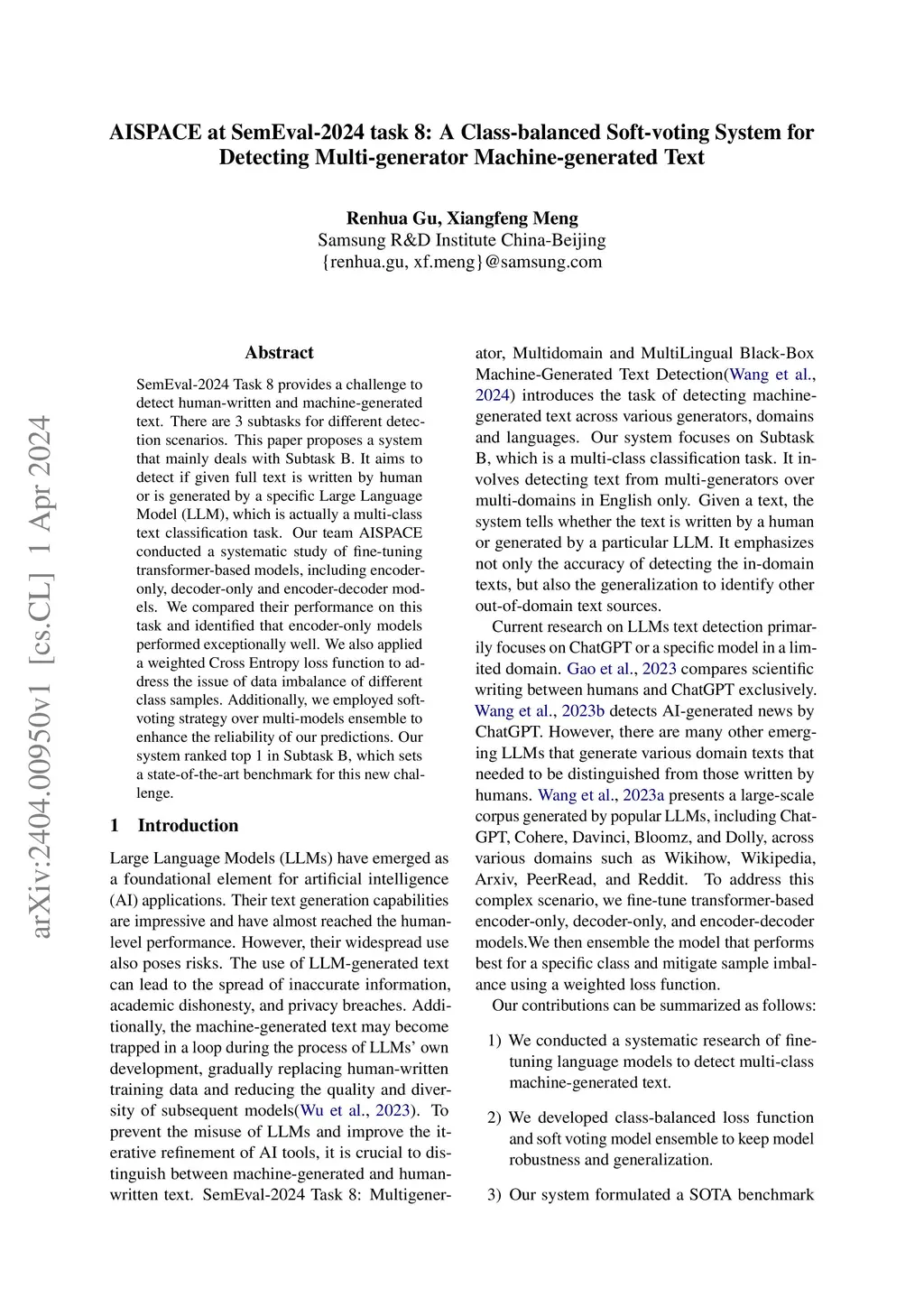 SemEval-2024 Task 8 provides a challenge to detect human-written and machine-generated text. There are 3 subtasks for different detection scenarios. This paper proposes a system that mainly deals with Subtask B. It aims to detect if given full text is written by human or is generated by a specific Large Language Model (LLM), which is actually a multi-class text classification task. Our team AISPACE conducted a systematic study of fine-tuning transformer-based models, including encoderonly, decoder-only and encoder-decoder models. We compared their performance on this task and identified that encoder-only models performed exceptionally well. We also applied a weighted Cross Entropy loss function to address the issue of data imbalance of different class samples. Additionally, we employed softvoting strategy over multi-models ensemble to enhance the reliability of our predictions. Our system ranked top 1 in Subtask B, which sets a state-of-the-art benchmark for this new challenge.