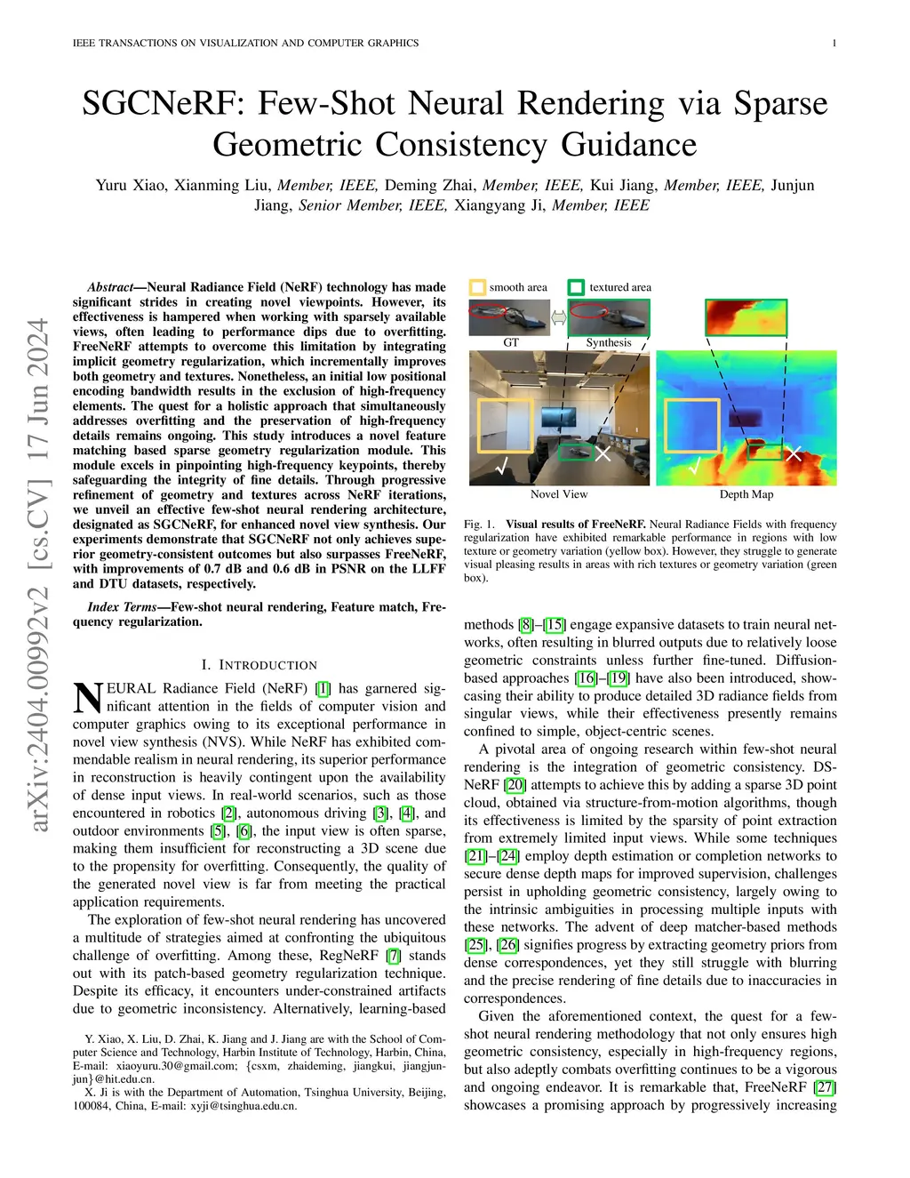 Neural Radiance Field (NeRF) technology has made significant strides in creating novel viewpoints. However, its effectiveness is hampered when working with sparsely available views, often leading to performance dips due to overfitting. FreeNeRF attempts to overcome this limitation by integrating implicit geometry regularization, which incrementally improves both geometry and textures. Nonetheless, an initial low positional encoding bandwidth results in the exclusion of high-frequency elements. The quest for a holistic approach that simultaneously addresses overfitting and the preservation of high-frequency details remains ongoing. This study presents a novel feature-matching-based sparse geometry regularization module, enhanced by a spatially consistent geometry filtering mechanism and a frequency-guided geometric regularization strategy. This module excels at accurately identifying high-frequency keypoints, effectively preserving fine structural details. Through progressive refinement of geometry and textures across NeRF iterations, we unveil an effective few-shot neural rendering architecture, designated as SGCNeRF, for enhanced novel view synthesis. Our experiments demonstrate that SGCNeRF not only achieves superior geometry-consistent outcomes but also surpasses FreeNeRF, with improvements of 0.7 dB in PSNR on LLFF and DTU.