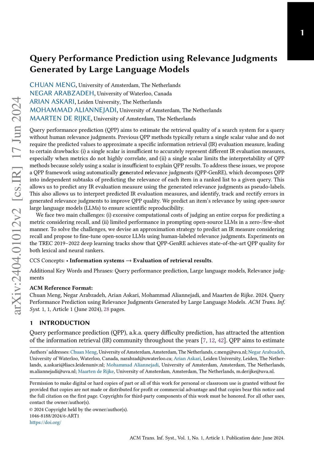 Query performance prediction (QPP) aims to estimate the retrieval quality of a search system for a query without human relevance judgments. Previous QPP methods typically return a single scalar value and do not require the predicted values to approximate a specific information retrieval (IR) evaluation measure, leading to certain drawbacks: (i) a single scalar is insufficient to accurately represent different IR evaluation measures, especially when metrics do not highly correlate, and (ii) a single scalar limits the interpretability of QPP methods because solely using a scalar is insufficient to explain QPP results. To address these issues, we propose a QPP framework using automatically generated relevance judgments (QPP-GenRE), which decomposes QPP into independent subtasks of predicting the relevance of each item in a ranked list to a given query. This allows us to predict any IR evaluation measure using the generated relevance judgments as pseudo-labels. This also allows us to interpret predicted IR evaluation measures, and identify, track and rectify errors in generated relevance judgments to improve QPP quality. We predict an item's relevance by using open-source large language models (LLMs) to ensure scientific reproducibility. We face two main challenges: (i) excessive computational costs of judging an entire corpus for predicting a metric considering recall, and (ii) limited performance in prompting open-source LLMs in a zero-/few-shot manner. To solve the challenges, we devise an approximation strategy to predict an IR measure considering recall and propose to fine-tune open-source LLMs using human-labeled relevance judgments. Experiments on the TREC 2019 to 2022 deep learning tracks and CAsT-19 and 20 datasets show that QPP-GenRE achieves state-of-the-art QPP quality for both lexical and neural rankers.
