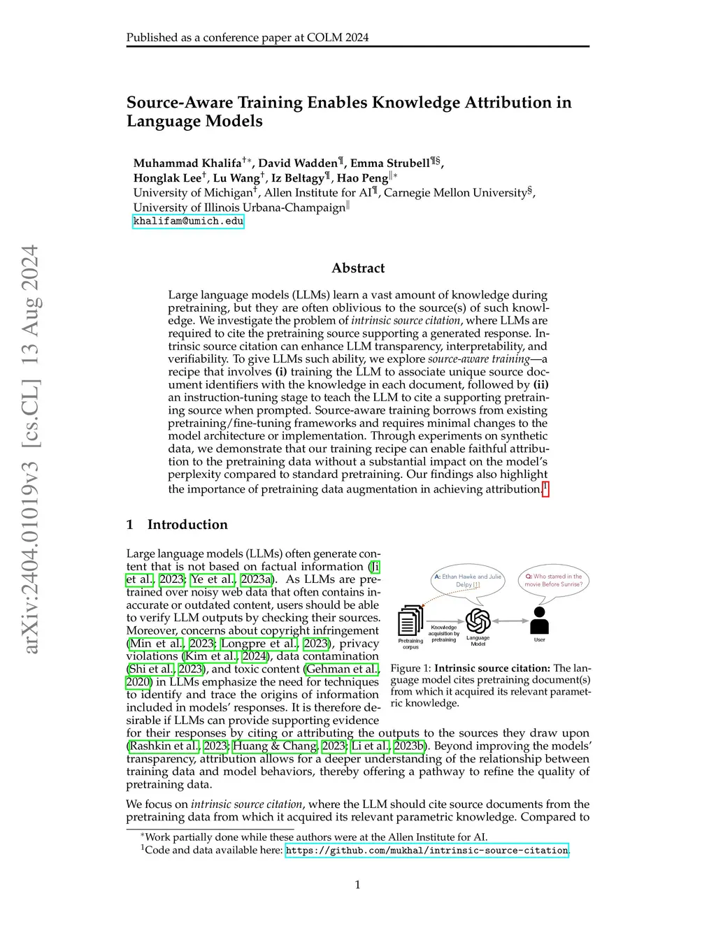 Large language models (LLMs) learn a vast amount of knowledge during pretraining, but they are often oblivious to the source(s) of such knowledge. We investigate the problem of intrinsic source citation, where LLMs are required to cite the pretraining source supporting a generated response. Intrinsic source citation can enhance LLM transparency, interpretability, and verifiability. To give LLMs such ability, we explore source-aware training -- a post pretraining recipe that involves (i) training the LLM to associate unique source document identifiers with the knowledge in each document, followed by (ii) an instruction-tuning to teach the LLM to cite a supporting pretraining source when prompted. Source-aware training can easily be applied to pretrained LLMs off the shelf, and diverges minimally from existing pretraining/fine-tuning frameworks. Through experiments on carefully curated data, we demonstrate that our training recipe can enable faithful attribution to the pretraining data without a substantial impact on the model's quality compared to standard pretraining. Our results also highlight the importance of data augmentation in achieving attribution. Code and data available here: \url{https://github.com/mukhal/intrinsic-source-citation}