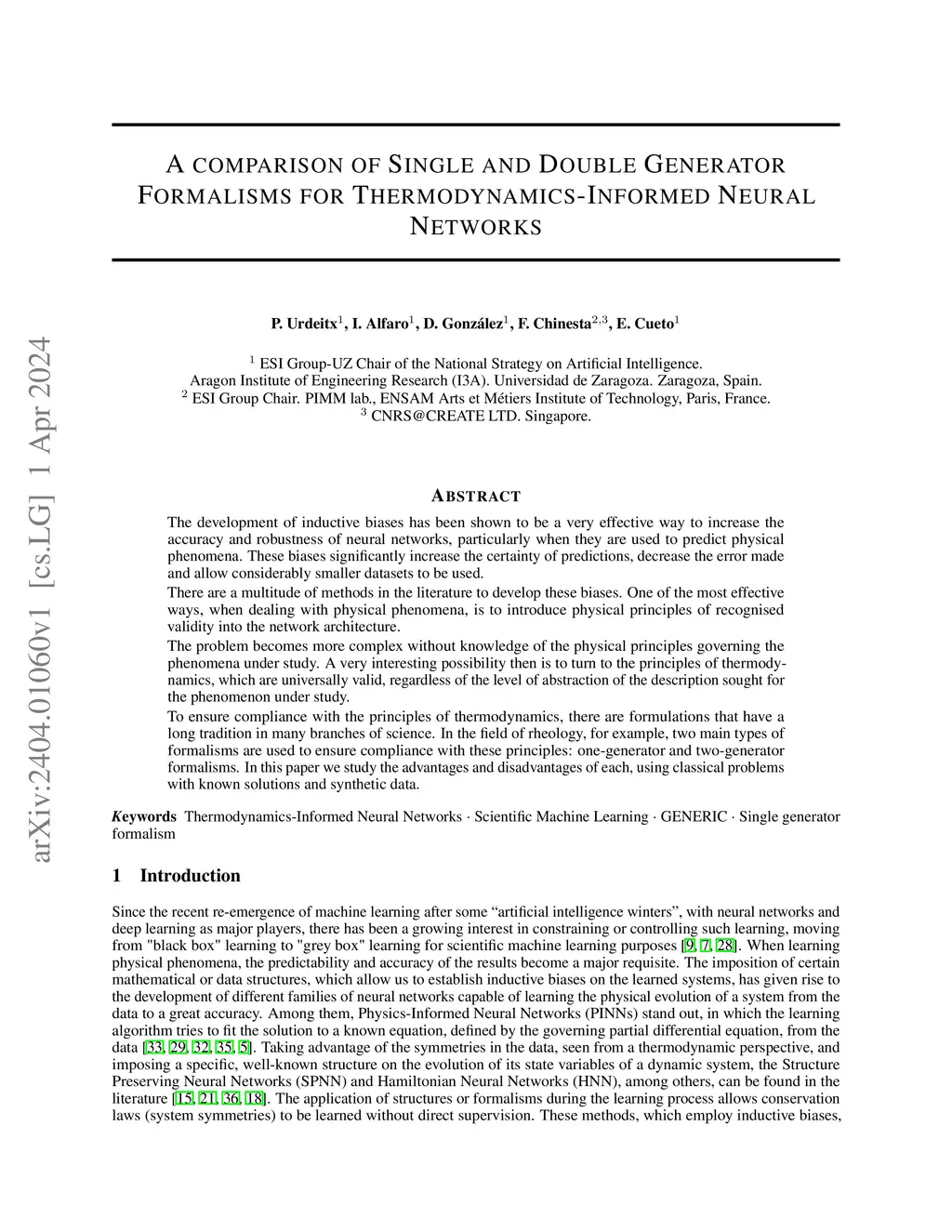 The development of inductive biases has been shown to be a very effective way to increase the accuracy and robustness of neural networks, particularly when they are used to predict physical phenomena. These biases significantly increase the certainty of predictions, decrease the error made and allow considerably smaller datasets to be used. There are a multitude of methods in the literature to develop these biases. One of the most effective ways, when dealing with physical phenomena, is to introduce physical principles of recognised validity into the network architecture. The problem becomes more complex without knowledge of the physical principles governing the phenomena under study. A very interesting possibility then is to turn to the principles of thermodynamics, which are universally valid, regardless of the level of abstraction of the description sought for the phenomenon under study. To ensure compliance with the principles of thermodynamics, there are formulations that have a long tradition in many branches of science. In the field of rheology, for example, two main types of formalisms are used to ensure compliance with these principles: one-generator and two-generator formalisms. In this paper we study the advantages and disadvantages of each, using classical problems with known solutions and synthetic data.