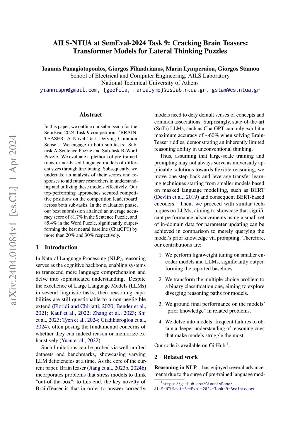 AILS-NTUA at SemEval-2024 Task 9: Cracking Brain Teasers: Transformer