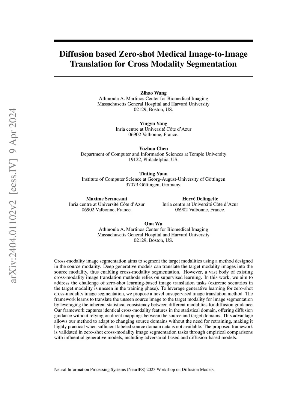 Cross-modality image segmentation aims to segment the target modalities using a method designed in the source modality. Deep generative models can translate the target modality images into the source modality, thus enabling cross-modality segmentation. However, a vast body of existing cross-modality image translation methods relies on supervised learning. In this work, we aim to address the challenge of zero-shot learning-based image translation tasks (extreme scenarios in the target modality is unseen in the training phase). To leverage generative learning for zero-shot cross-modality image segmentation, we propose a novel unsupervised image translation method. The framework learns to translate the unseen source image to the target modality for image segmentation by leveraging the inherent statistical consistency between different modalities for diffusion guidance. Our framework captures identical cross-modality features in the statistical domain, offering diffusion guidance without relying on direct mappings between the source and target domains. This advantage allows our method to adapt to changing source domains without the need for retraining, making it highly practical when sufficient labeled source domain data is not available. The proposed framework is validated in zero-shot cross-modality image segmentation tasks through empirical comparisons with influential generative models, including adversarial-based and diffusion-based models.