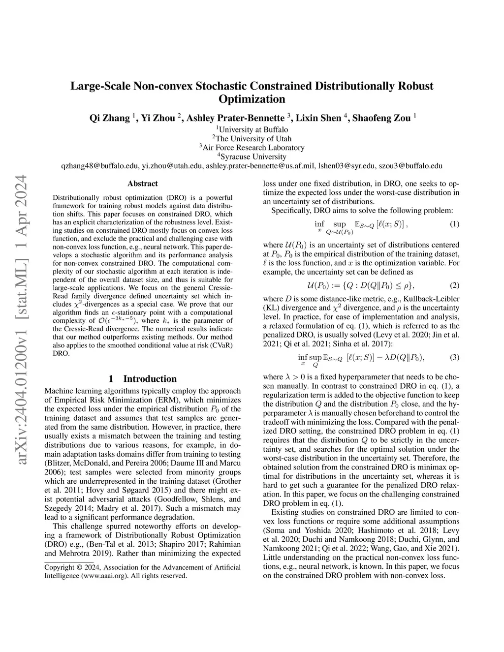 Distributionally robust optimization (DRO) is a powerful framework for training robust models against data distribution shifts. This paper focuses on constrained DRO, which has an explicit characterization of the robustness level. Existing studies on constrained DRO mostly focus on convex loss function, and exclude the practical and challenging case with non-convex loss function, e.g., neural network. This paper develops a stochastic algorithm and its performance analysis for non-convex constrained DRO. The computational complexity of our stochastic algorithm at each iteration is independent of the overall dataset size, and thus is suitable for large-scale applications. We focus on the general Cressie-Read family divergence defined uncertainty set which includes -divergences as a special case. We prove that our algorithm finds an -stationary point with a computational complexity of , where is the parameter of the Cressie-Read divergence. The numerical results indicate that our method outperforms existing methods.} Our method also applies to the smoothed conditional value at risk (CVaR) DRO.