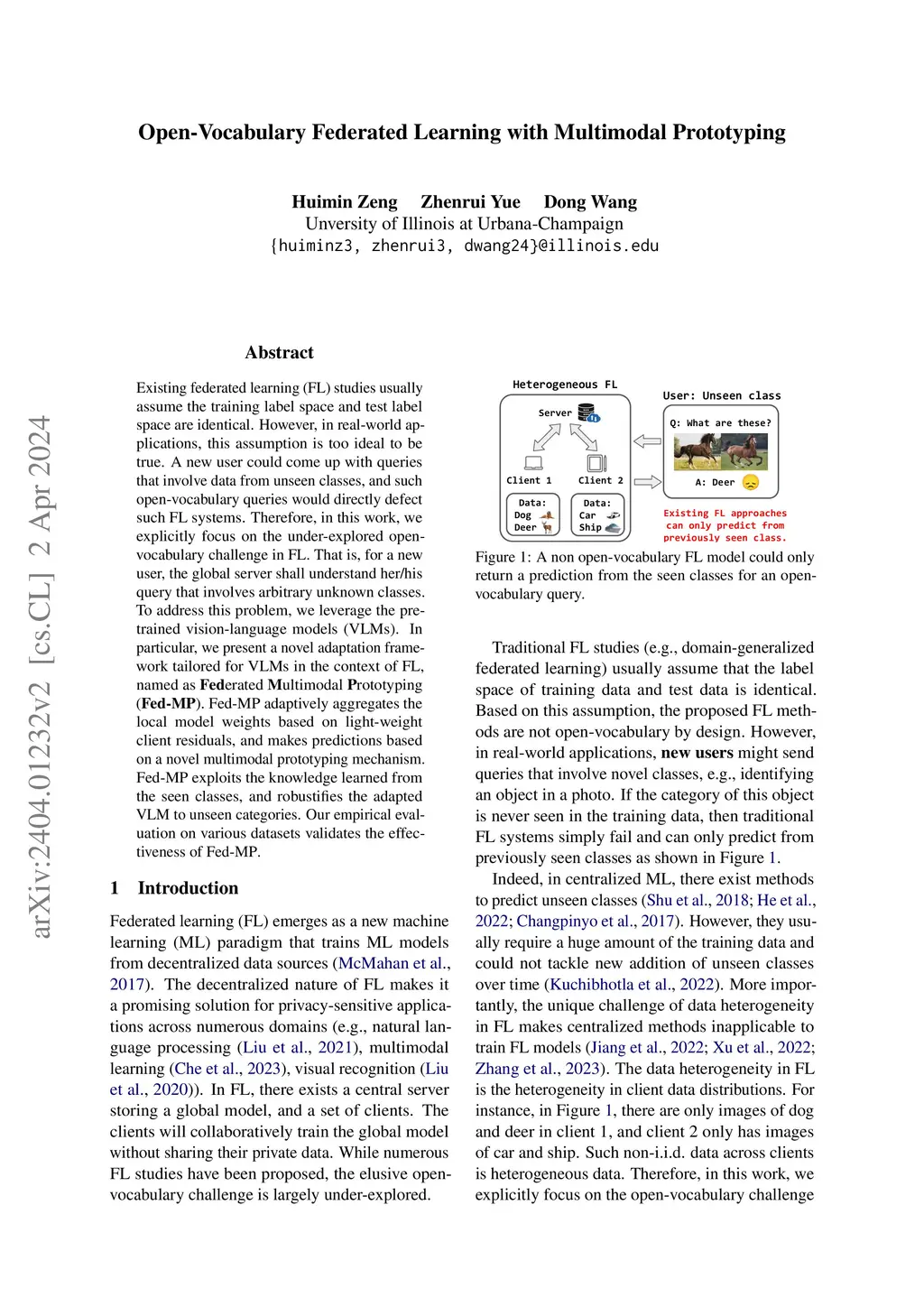 Existing federated learning (FL) studies usually assume the training label space and test label space are identical. However, in real-world applications, this assumption is too ideal to be true. A new user could come up with queries that involve data from unseen classes, and such open-vocabulary queries would directly defect such FL systems. Therefore, in this work, we explicitly focus on the under-explored open-vocabulary challenge in FL. That is, for a new user, the global server shall understand her/his query that involves arbitrary unknown classes. To address this problem, we leverage the pre-trained vision-language models (VLMs). In particular, we present a novel adaptation framework tailored for VLMs in the context of FL, named as Federated Multimodal Prototyping (Fed-MP). Fed-MP adaptively aggregates the local model weights based on light-weight client residuals, and makes predictions based on a novel multimodal prototyping mechanism. Fed-MP exploits the knowledge learned from the seen classes, and robustifies the adapted VLM to unseen categories. Our empirical evaluation on various datasets validates the effectiveness of Fed-MP.