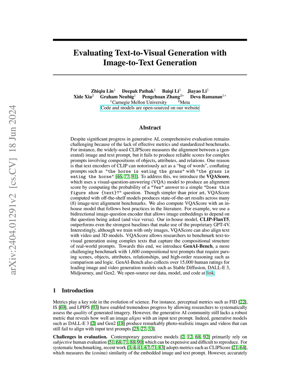 Despite significant progress in generative AI, comprehensive evaluation remains challenging because of the lack of effective metrics and standardized benchmarks. For instance, the widely-used CLIPScore measures the alignment between a (generated) image and text prompt, but it fails to produce reliable scores for complex prompts involving compositions of objects, attributes, and relations. One reason is that text encoders of CLIP can notoriously act as a "bag of words", conflating prompts such as "the horse is eating the grass" with "the grass is eating the horse". To address this, we introduce the VQAScore, which uses a visual-question-answering (VQA) model to produce an alignment score by computing the probability of a "Yes" answer to a simple "Does this figure show '{text}'?" question. Though simpler than prior art, VQAScore computed with off-the-shelf models produces state-of-the-art results across many (8) image-text alignment benchmarks. We also compute VQAScore with an in-house model that follows best practices in the literature. For example, we use a bidirectional image-question encoder that allows image embeddings to depend on the question being asked (and vice versa). Our in-house model, CLIP-FlanT5, outperforms even the strongest baselines that make use of the proprietary GPT-4V. Interestingly, although we train with only images, VQAScore can also align text with video and 3D models. VQAScore allows researchers to benchmark text-to-visual generation using complex texts that capture the compositional structure of real-world prompts. We introduce GenAI-Bench, a more challenging benchmark with 1,600 compositional text prompts that require parsing scenes, objects, attributes, relationships, and high-order reasoning like comparison and logic. GenAI-Bench also offers over 15,000 human ratings for leading image and video generation models such as Stable Diffusion, DALL-E 3, and Gen2.