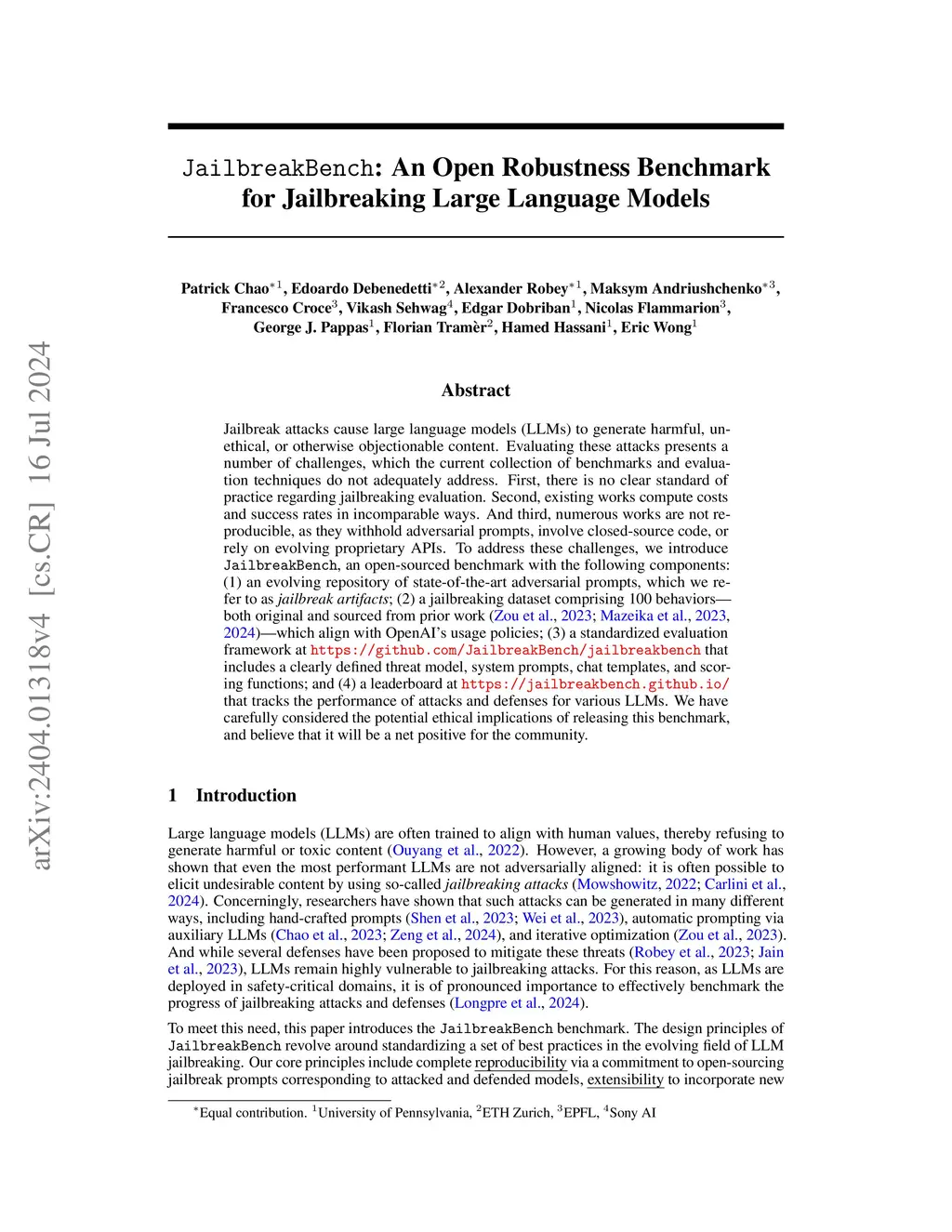 Jailbreak attacks cause large language models (LLMs) to generate harmful, unethical, or otherwise objectionable content. Evaluating these attacks presents a number of challenges, which the current collection of benchmarks and evaluation techniques do not adequately address. First, there is no clear standard of practice regarding jailbreaking evaluation. Second, existing works compute costs and success rates in incomparable ways. And third, numerous works are not reproducible, as they withhold adversarial prompts, involve closed-source code, or rely on evolving proprietary APIs. To address these challenges, we introduce JailbreakBench, an open-sourced benchmark with the following components: (1) an evolving repository of state-of-the-art adversarial prompts, which we refer to as jailbreak artifacts; (2) a jailbreaking dataset comprising 100 behaviors -- both original and sourced from prior work (Zou et al., 2023; Mazeika et al., 2023, 2024) -- which align with OpenAI's usage policies; (3) a standardized evaluation framework at https://github.com/JailbreakBench/jailbreakbench that includes a clearly defined threat model, system prompts, chat templates, and scoring functions; and (4) a leaderboard at https://jailbreakbench.github.io/ that tracks the performance of attacks and defenses for various LLMs. We have carefully considered the potential ethical implications of releasing this benchmark, and believe that it will be a net positive for the community.