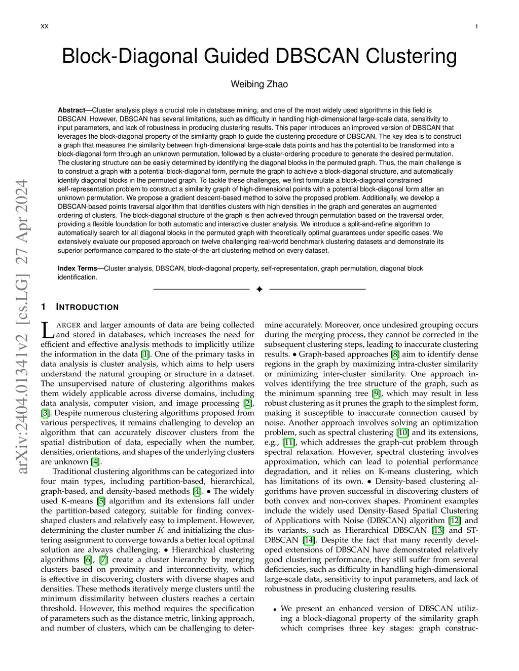 Cluster analysis plays a crucial role in database mining, and one of the most widely used algorithms in this field is DBSCAN. However, DBSCAN has several limitations, such as difficulty in handling high-dimensional large-scale data, sensitivity to input parameters, and lack of robustness in producing clustering results. This paper introduces an improved version of DBSCAN that leverages the block-diagonal property of the similarity graph to guide the clustering procedure of DBSCAN. The key idea is to construct a graph that measures the similarity between high-dimensional large-scale data points and has the potential to be transformed into a block-diagonal form through an unknown permutation, followed by a cluster-ordering procedure to generate the desired permutation. The clustering structure can be easily determined by identifying the diagonal blocks in the permuted graph. We propose a gradient descent-based method to solve the proposed problem. Additionally, we develop a DBSCAN-based points traversal algorithm that identifies clusters with high densities in the graph and generates an augmented ordering of clusters. The block-diagonal structure of the graph is then achieved through permutation based on the traversal order, providing a flexible foundation for both automatic and interactive cluster analysis. We introduce a split-and-refine algorithm to automatically search for all diagonal blocks in the permuted graph with theoretically optimal guarantees under specific cases. We extensively evaluate our proposed approach on twelve challenging real-world benchmark clustering datasets and demonstrate its superior performance compared to the state-of-the-art clustering method on every dataset.
