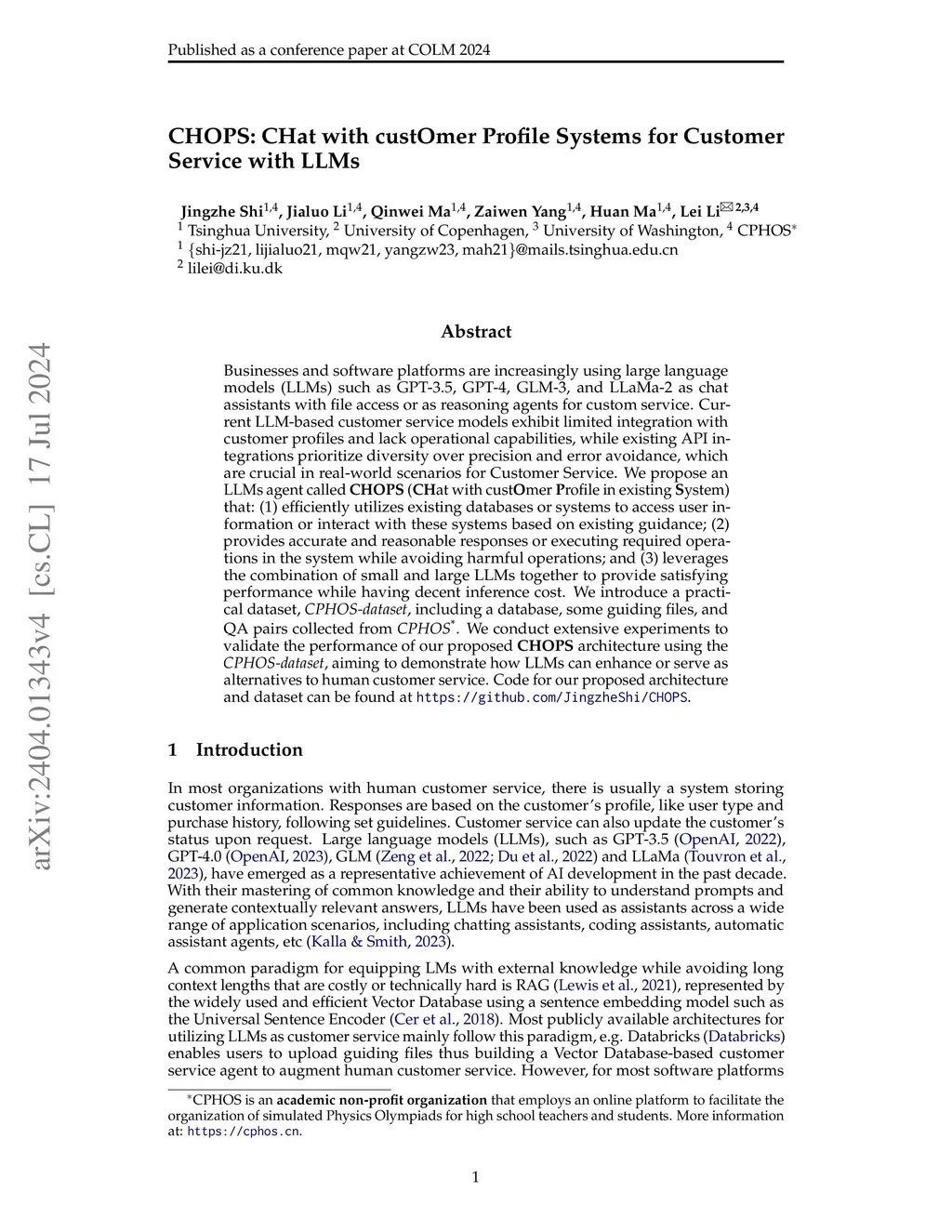 Businesses and software platforms are increasingly turning to Large Language Models (LLMs) such as GPT-3.5, GPT-4, GLM-3, and LLaMa-2 for chat assistance with file access or as reasoning agents for customer service. However, current LLM-based customer service models have limited integration with customer profiles and lack the operational capabilities necessary for effective service. Moreover, existing API integrations emphasize diversity over the precision and error avoidance essential in real-world customer service scenarios. To address these issues, we propose an LLM agent named CHOPS (CHat with custOmer Profile in existing System), designed to: (1) efficiently utilize existing databases or systems for accessing user information or interacting with these systems following existing guidelines; (2) provide accurate and reasonable responses or carry out required operations in the system while avoiding harmful operations; and (3) leverage a combination of small and large LLMs to achieve satisfying performance at a reasonable inference cost. We introduce a practical dataset, the CPHOS-dataset, which includes a database, guiding files, and QA pairs collected from CPHOS, an online platform that facilitates the organization of simulated Physics Olympiads for high school teachers and students. We have conducted extensive experiments to validate the performance of our proposed CHOPS architecture using the CPHOS-dataset, with the aim of demonstrating how LLMs can enhance or serve as alternatives to human customer service. Code for our proposed architecture and dataset can be found at {https://github.com/JingzheShi/CHOPS}.