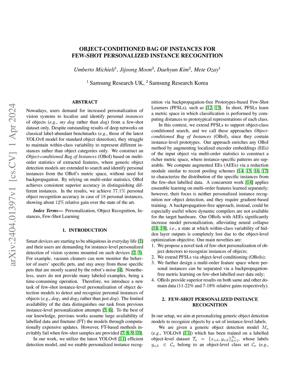 Nowadays, users demand for increased personalization of vision systems to localize and identify personal instances of objects (e.g., my dog rather than dog) from a few-shot dataset only. Despite outstanding results of deep networks on classical label-abundant benchmarks (e.g., those of the latest YOLOv8 model for standard object detection), they struggle to maintain within-class variability to represent different instances rather than object categories only. We construct an Object-conditioned Bag of Instances (OBoI) based on multi-order statistics of extracted features, where generic object detection models are extended to search and identify personal instances from the OBoI's metric space, without need for backpropagation. By relying on multi-order statistics, OBoI achieves consistent superior accuracy in distinguishing different instances. In the results, we achieve 77.1% personal object recognition accuracy in case of 18 personal instances, showing about 12% relative gain over the state of the art.