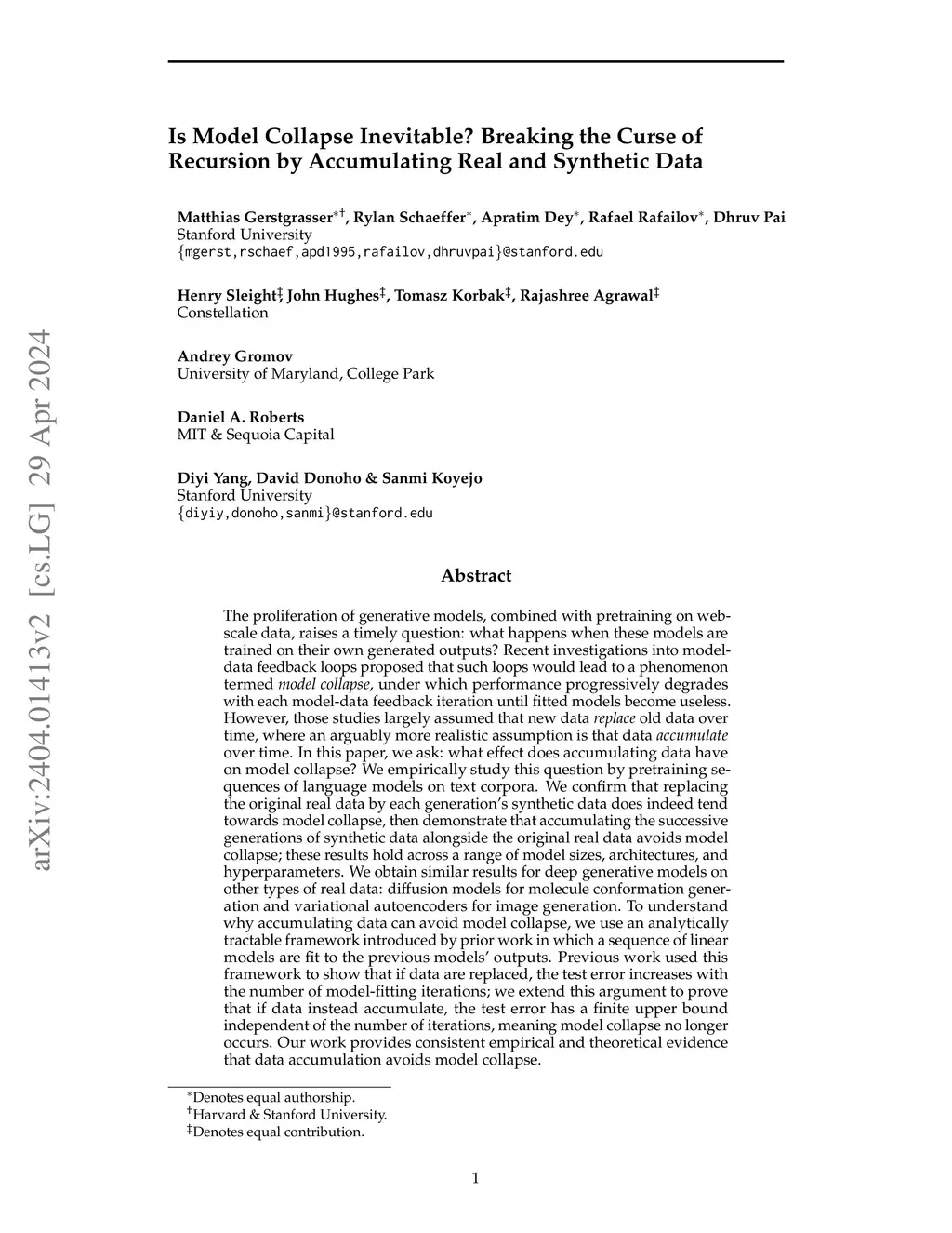 The proliferation of generative models, combined with pretraining on web-scale data, raises a timely question: what happens when these models are trained on their own generated outputs? Recent investigations into model-data feedback loops proposed that such loops would lead to a phenomenon termed model collapse, under which performance progressively degrades with each model-data feedback iteration until fitted models become useless. However, those studies largely assumed that new data replace old data over time, where an arguably more realistic assumption is that data accumulate over time. In this paper, we ask: what effect does accumulating data have on model collapse? We empirically study this question by pretraining sequences of language models on text corpora. We confirm that replacing the original real data by each generation's synthetic data does indeed tend towards model collapse, then demonstrate that accumulating the successive generations of synthetic data alongside the original real data avoids model collapse; these results hold across a range of model sizes, architectures, and hyperparameters. We obtain similar results for deep generative models on other types of real data: diffusion models for molecule conformation generation and variational autoencoders for image generation. To understand why accumulating data can avoid model collapse, we use an analytically tractable framework introduced by prior work in which a sequence of linear models are fit to the previous models' outputs. Previous work used this framework to show that if data are replaced, the test error increases with the number of model-fitting iterations; we extend this argument to prove that if data instead accumulate, the test error has a finite upper bound independent of the number of iterations, meaning model collapse no longer occurs.