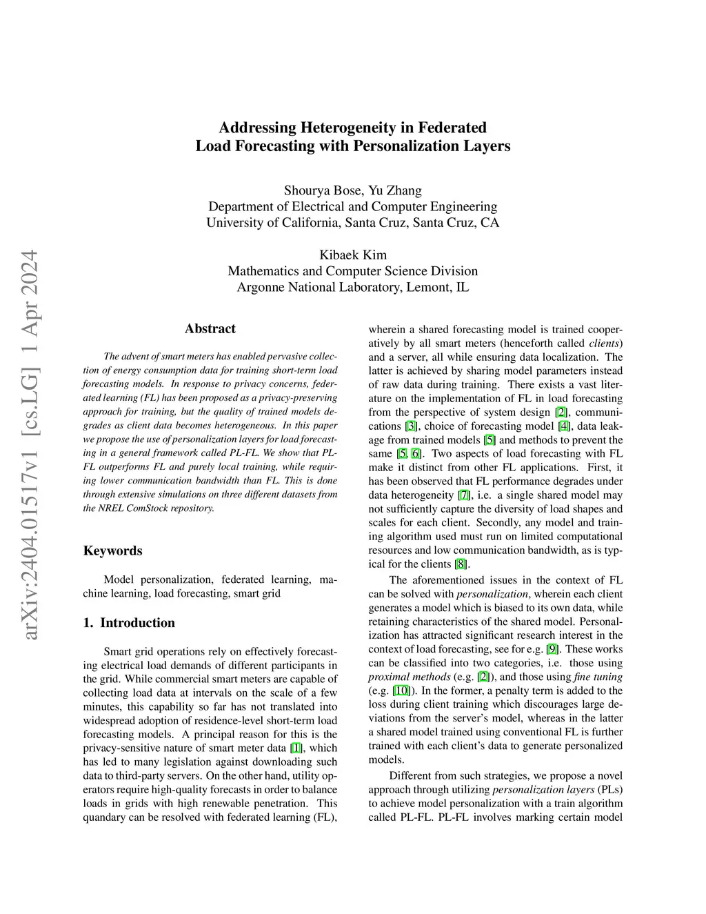 The advent of smart meters has enabled pervasive collection of energy consumption data for training short-term load forecasting models. In response to privacy concerns, federated learning (FL) has been proposed as a privacy-preserving approach for training, but the quality of trained models degrades as client data becomes heterogeneous. In this paper we propose the use of personalization layers for load forecasting in a general framework called PL-FL. We show that PL-FL outperforms FL and purely local training, while requiring lower communication bandwidth than FL. This is done through extensive simulations on three different datasets from the NREL ComStock repository.