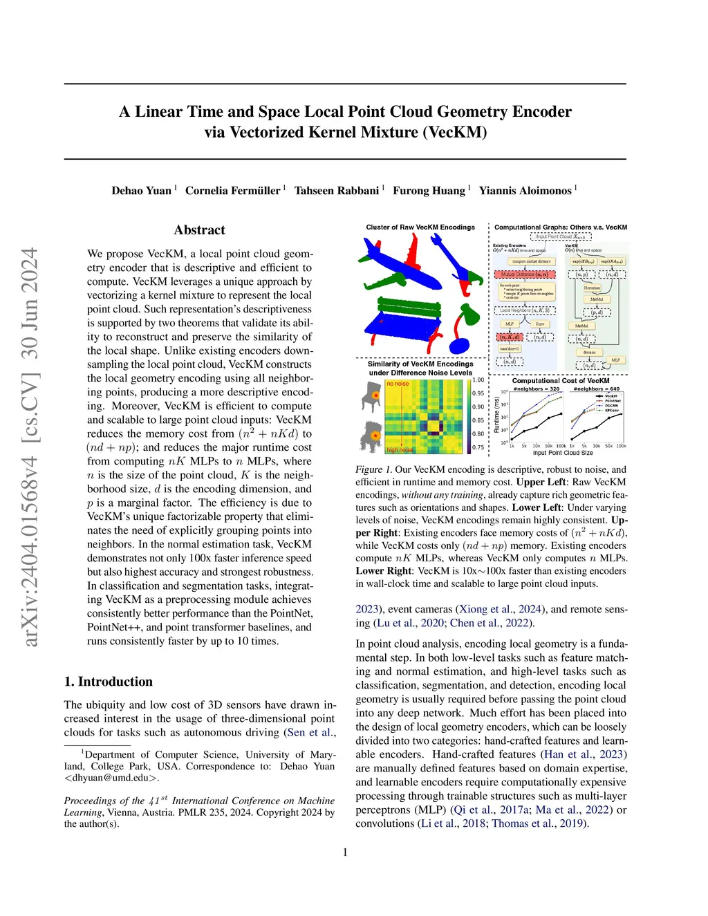 We propose VecKM, a local point cloud geometry encoder that is descriptive and efficient to compute. VecKM leverages a unique approach by vectorizing a kernel mixture to represent the local point cloud. Such representation's descriptiveness is supported by two theorems that validate its ability to reconstruct and preserve the similarity of the local shape. Unlike existing encoders downsampling the local point cloud, VecKM constructs the local geometry encoding using all neighboring points, producing a more descriptive encoding. Moreover, VecKM is efficient to compute and scalable to large point cloud inputs: VecKM reduces the memory cost from to ; and reduces the major runtime cost from computing MLPs to MLPs, where is the size of the point cloud, is the neighborhood size, is the encoding dimension, and is a marginal factor. The efficiency is due to VecKM's unique factorizable property that eliminates the need of explicitly grouping points into neighbors. In the normal estimation task, VecKM demonstrates not only 100x faster inference speed but also highest accuracy and strongest robustness. In classification and segmentation tasks, integrating VecKM as a preprocessing module achieves consistently better performance than the PointNet, PointNet++, and point transformer baselines, and runs consistently faster by up to 10 times.