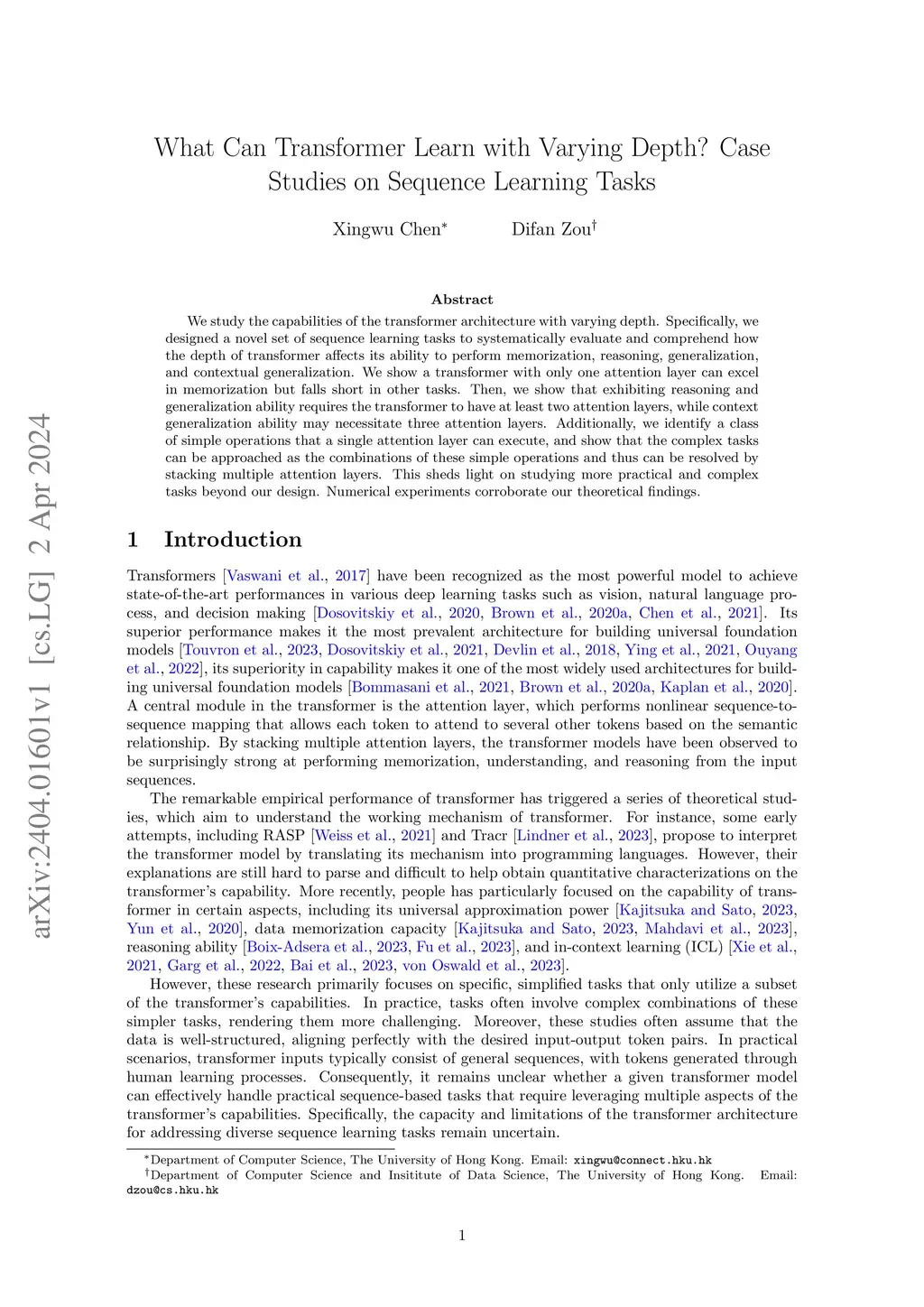 We study the capabilities of the transformer architecture with varying depth. Specifically, we designed a novel set of sequence learning tasks to systematically evaluate and comprehend how the depth of transformer affects its ability to perform memorization, reasoning, generalization, and contextual generalization. We show a transformer with only one attention layer can excel in memorization but falls short in other tasks. Then, we show that exhibiting reasoning and generalization ability requires the transformer to have at least two attention layers, while context generalization ability may necessitate three attention layers. Additionally, we identify a class of simple operations that a single attention layer can execute, and show that the complex tasks can be approached as the combinations of these simple operations and thus can be resolved by stacking multiple attention layers. This sheds light on studying more practical and complex tasks beyond our design. Numerical experiments corroborate our theoretical findings.