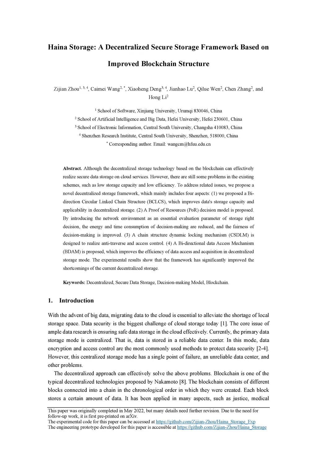 Haina Storage: A Decentralized Secure Storage Framework Based on