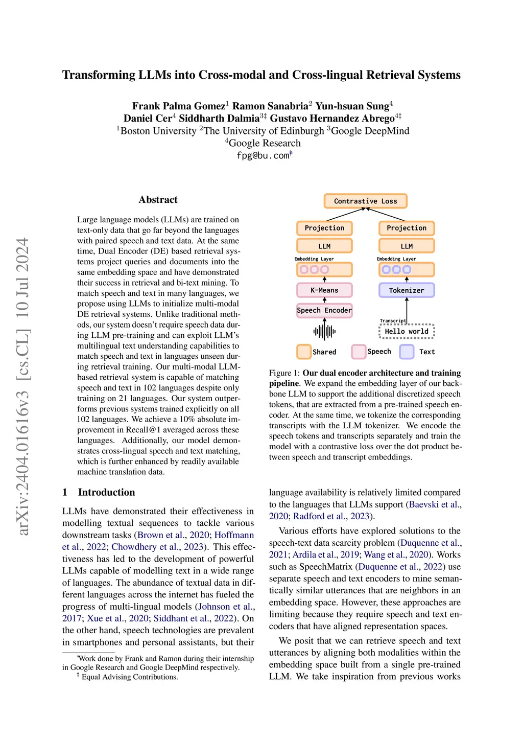 Large language models (LLMs) are trained on text-only data that go far beyond the languages with paired speech and text data. At the same time, Dual Encoder (DE) based retrieval systems project queries and documents into the same embedding space and have demonstrated their success in retrieval and bi-text mining. To match speech and text in many languages, we propose using LLMs to initialize multi-modal DE retrieval systems. Unlike traditional methods, our system doesn't require speech data during LLM pre-training and can exploit LLM's multilingual text understanding capabilities to match speech and text in languages unseen during retrieval training. Our multi-modal LLM-based retrieval system is capable of matching speech and text in 102 languages despite only training on 21 languages. Our system outperforms previous systems trained explicitly on all 102 languages. We achieve a 10% absolute improvement in Recall@1 averaged across these languages. Additionally, our model demonstrates cross-lingual speech and text matching, which is further enhanced by readily available machine translation data.