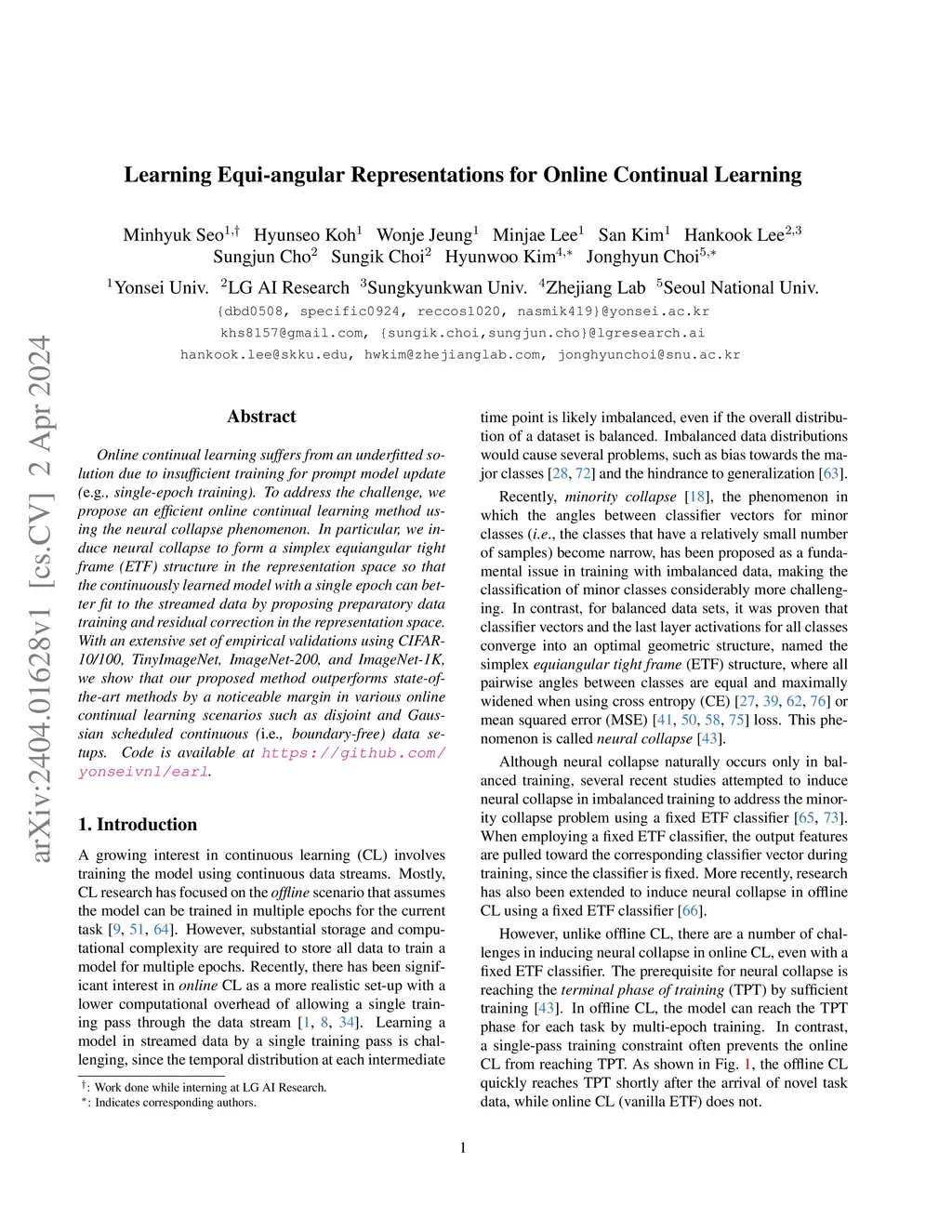 Online continual learning suffers from an underfitted solution due to insufficient training for prompt model update (e.g., single-epoch training). To address the challenge, we propose an efficient online continual learning method using the neural collapse phenomenon. In particular, we induce neural collapse to form a simplex equiangular tight frame (ETF) structure in the representation space so that the continuously learned model with a single epoch can better fit to the streamed data by proposing preparatory data training and residual correction in the representation space. With an extensive set of empirical validations using CIFAR-10/100, TinyImageNet, ImageNet-200, and ImageNet-1K, we show that our proposed method outperforms state-of-the-art methods by a noticeable margin in various online continual learning scenarios such as disjoint and Gaussian scheduled continuous (i.e., boundary-free) data setups.