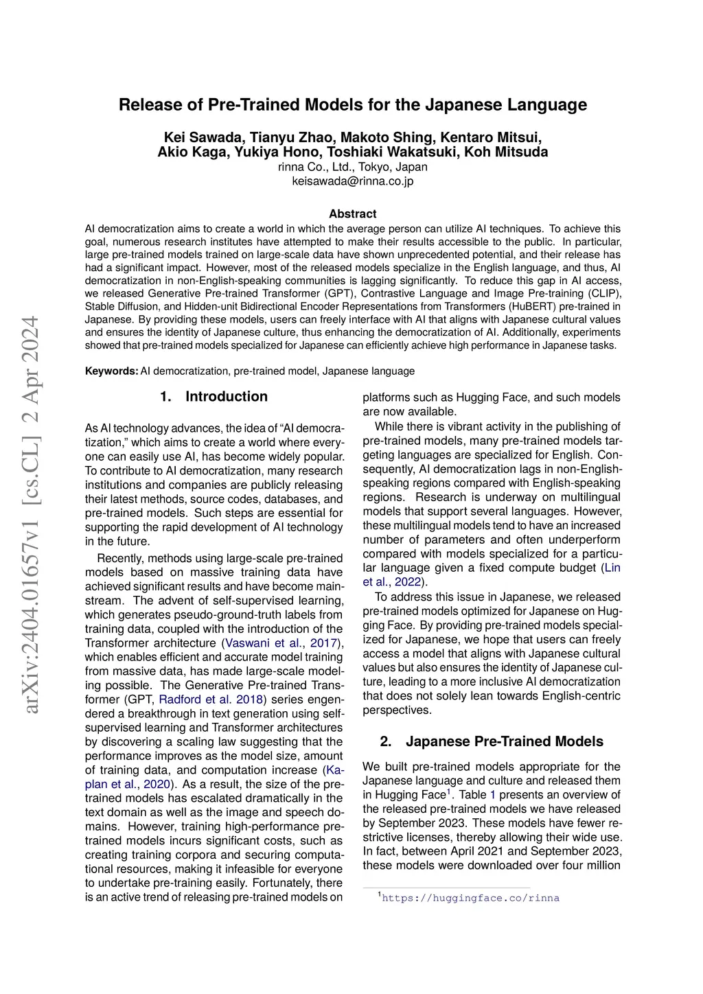 AI democratization aims to create a world in which the average person can utilize AI techniques. To achieve this goal, numerous research institutes have attempted to make their results accessible to the public. In particular, large pre-trained models trained on large-scale data have shown unprecedented potential, and their release has had a significant impact. However, most of the released models specialize in the English language, and thus, AI democratization in non-English-speaking communities is lagging significantly. To reduce this gap in AI access, we released Generative Pre-trained Transformer (GPT), Contrastive Language and Image Pre-training (CLIP), Stable Diffusion, and Hidden-unit Bidirectional Encoder Representations from Transformers (HuBERT) pre-trained in Japanese. By providing these models, users can freely interface with AI that aligns with Japanese cultural values and ensures the identity of Japanese culture, thus enhancing the democratization of AI. Additionally, experiments showed that pre-trained models specialized for Japanese can efficiently achieve high performance in Japanese tasks.