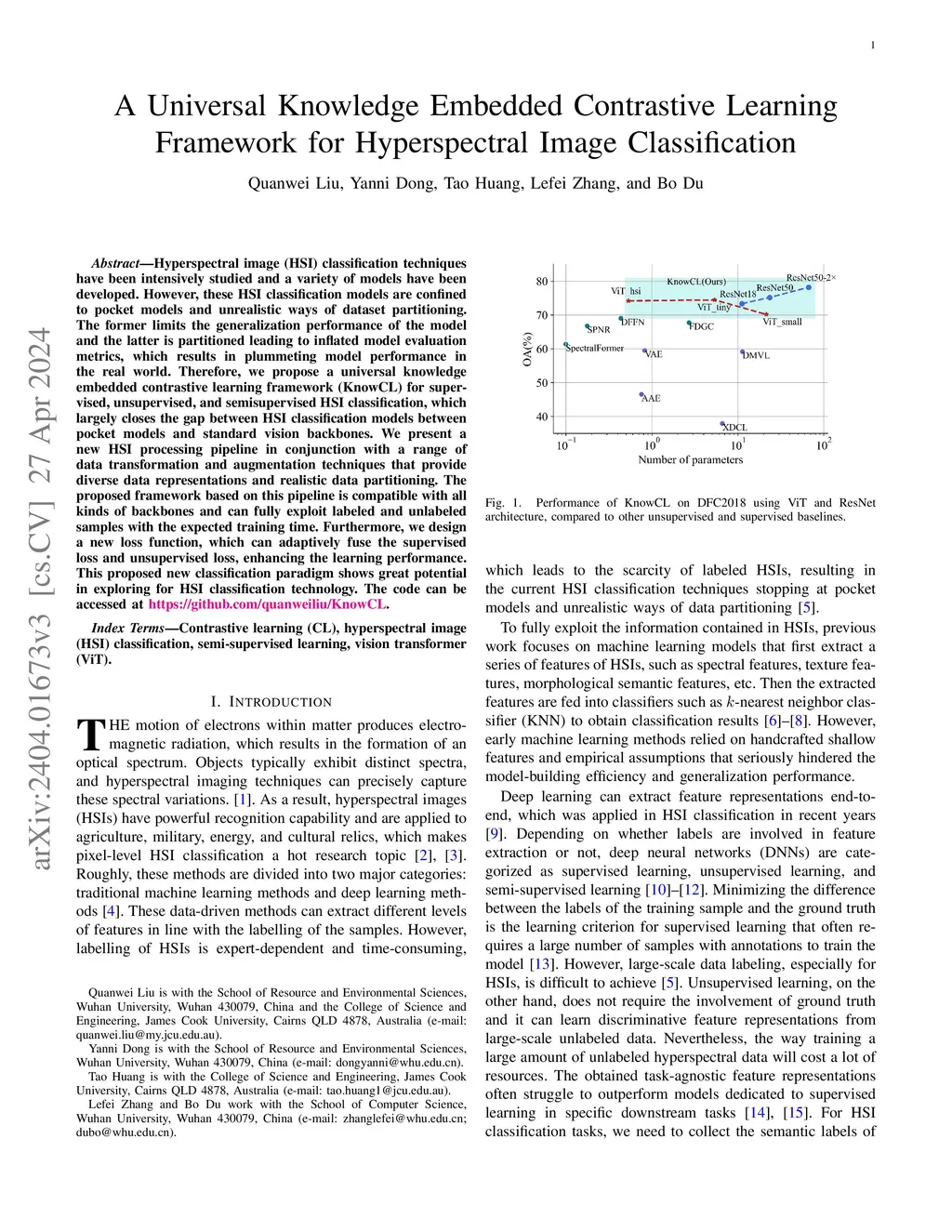 Hyperspectral image (HSI) classification techniques have been intensively studied and a variety of models have been developed. However, these HSI classification models are confined to pocket models and unrealistic ways of dataset partitioning. The former limits the generalization performance of the model and the latter is partitioned leading to inflated model evaluation metrics, which results in plummeting model performance in the real world. Therefore, we propose a universal knowledge embedded contrastive learning framework (KnowCL) for supervised, unsupervised, and semisupervised HSI classification, which largely closes the gap between HSI classification models between pocket models and standard vision backbones. We present a new HSI processing pipeline in conjunction with a range of data transformation and augmentation techniques that provide diverse data representations and realistic data partitioning. The proposed framework based on this pipeline is compatible with all kinds of backbones and can fully exploit labeled and unlabeled samples with the expected training time. Furthermore, we design a new loss function, which can adaptively fuse the supervised loss and unsupervised loss, enhancing the learning performance. This proposed new classification paradigm shows great potential in exploring for HSI classification technology. The code can be accessed at \url{https://github.com/quanweiliu/KnowCL}.