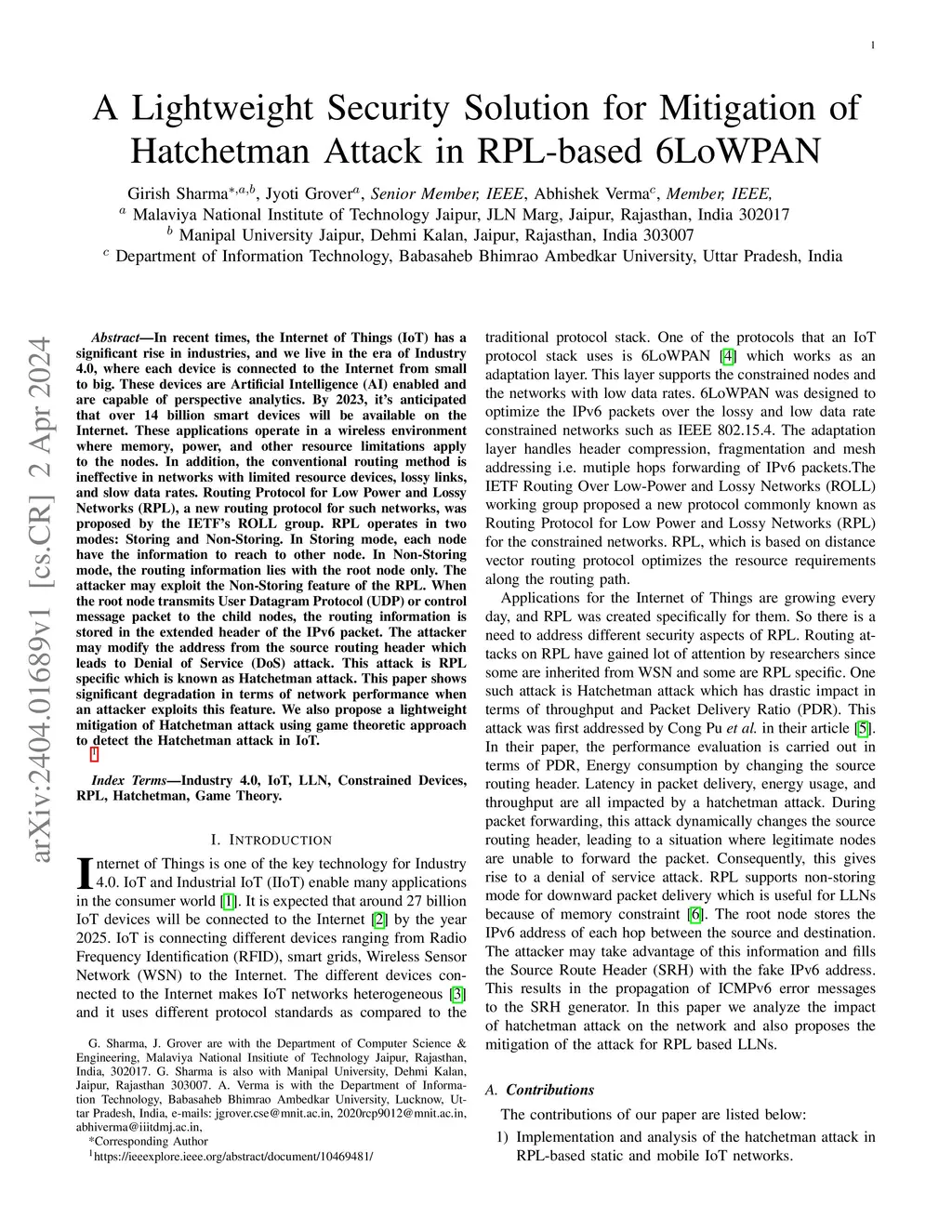 A Lightweight Security Solution for Mitigation of Hatchetman Attack in