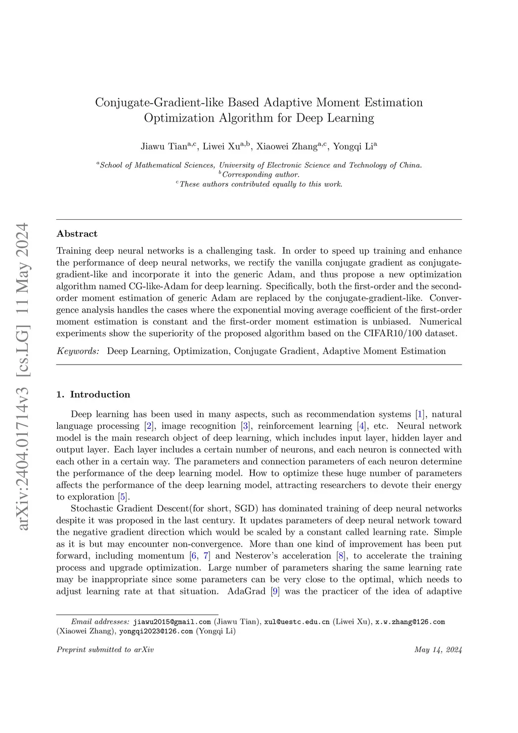 Conjugate-Gradient-like Based Adaptive Moment Estimation Optimization Algorithm for Deep Learning