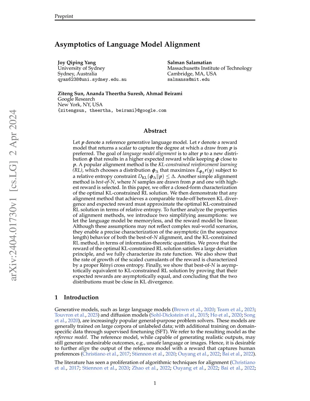 Let denote a generative language model. Let denote a reward model that returns a scalar that captures the degree at which a draw from is preferred. The goal of language model alignment is to alter to a new distribution that results in a higher expected reward while keeping close to A popular alignment method is the KL-constrained reinforcement learning (RL), which chooses a distribution that maximizes subject to a relative entropy constraint Another simple alignment method is best-of-, where samples are drawn from and one with highest reward is selected. In this paper, we offer a closed-form characterization of the optimal KL-constrained RL solution. We demonstrate that any alignment method that achieves a comparable trade-off between KL divergence and reward must approximate the optimal KL-constrained RL solution in terms of relative entropy. To further analyze the properties of alignment methods, we introduce two simplifying assumptions: we let the language model be memoryless, and the reward model be linear. Although these assumptions may not reflect complex real-world scenarios, they enable a precise characterization of the asymptotic behavior of both the best-of- alignment, and the KL-constrained RL method, in terms of information-theoretic quantities. We prove that the reward of the optimal KL-constrained RL solution satisfies a large deviation principle, and we fully characterize its rate function. We also show that the rate of growth of the scaled cumulants of the reward is characterized by a proper Renyi cross entropy. Finally, we show that best-of- is asymptotically equivalent to KL-constrained RL solution by proving that their expected rewards are asymptotically equal, and concluding that the two distributions must be close in KL divergence.