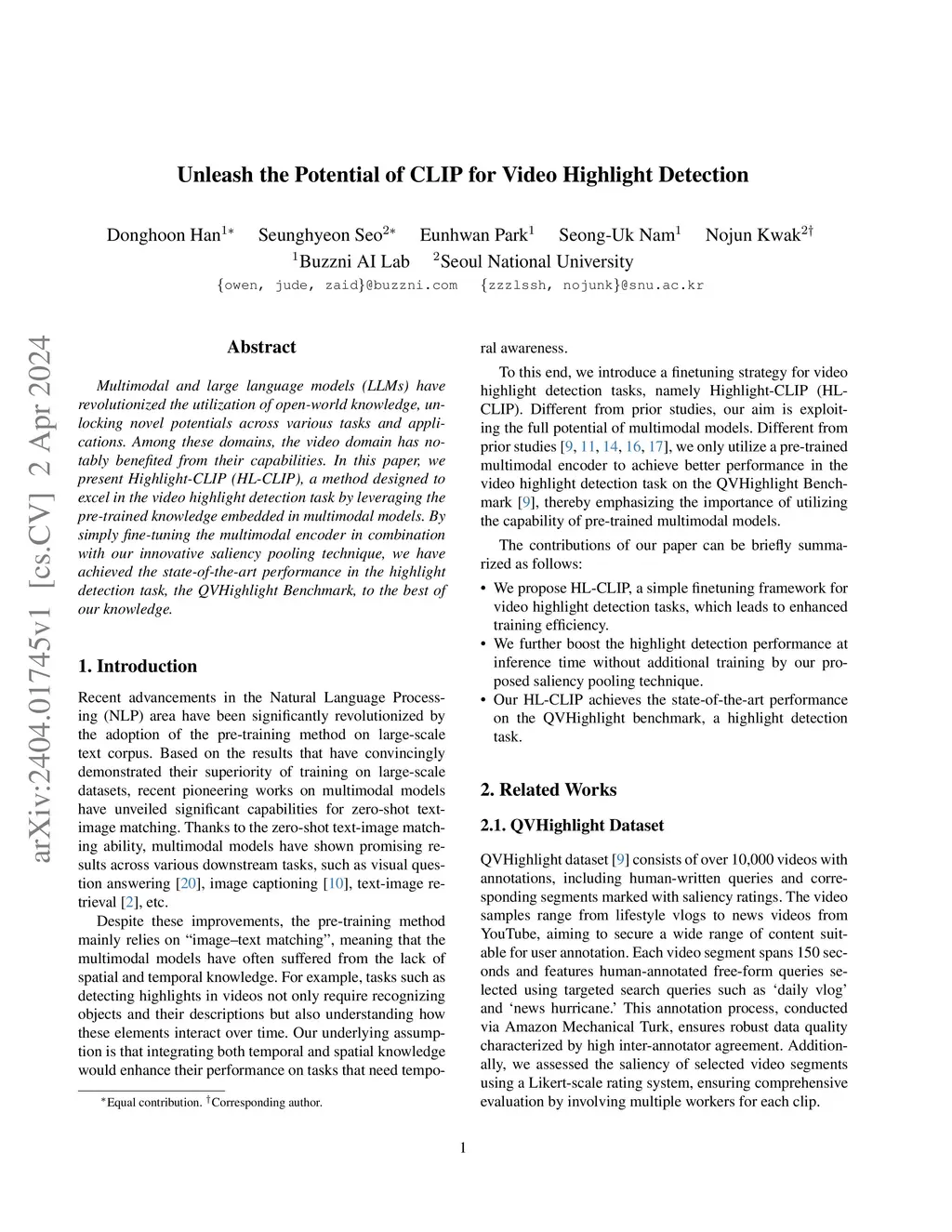 Multimodal and large language models (LLMs) have revolutionized the utilization of open-world knowledge, unlocking novel potentials across various tasks and applications. Among these domains, the video domain has notably benefited from their capabilities. In this paper, we present Highlight-CLIP (HL-CLIP), a method designed to excel in the video highlight detection task by leveraging the pre-trained knowledge embedded in multimodal models. By simply fine-tuning the multimodal encoder in combination with our innovative saliency pooling technique, we have achieved the state-of-the-art performance in the highlight detection task, the QVHighlight Benchmark, to the best of our knowledge.