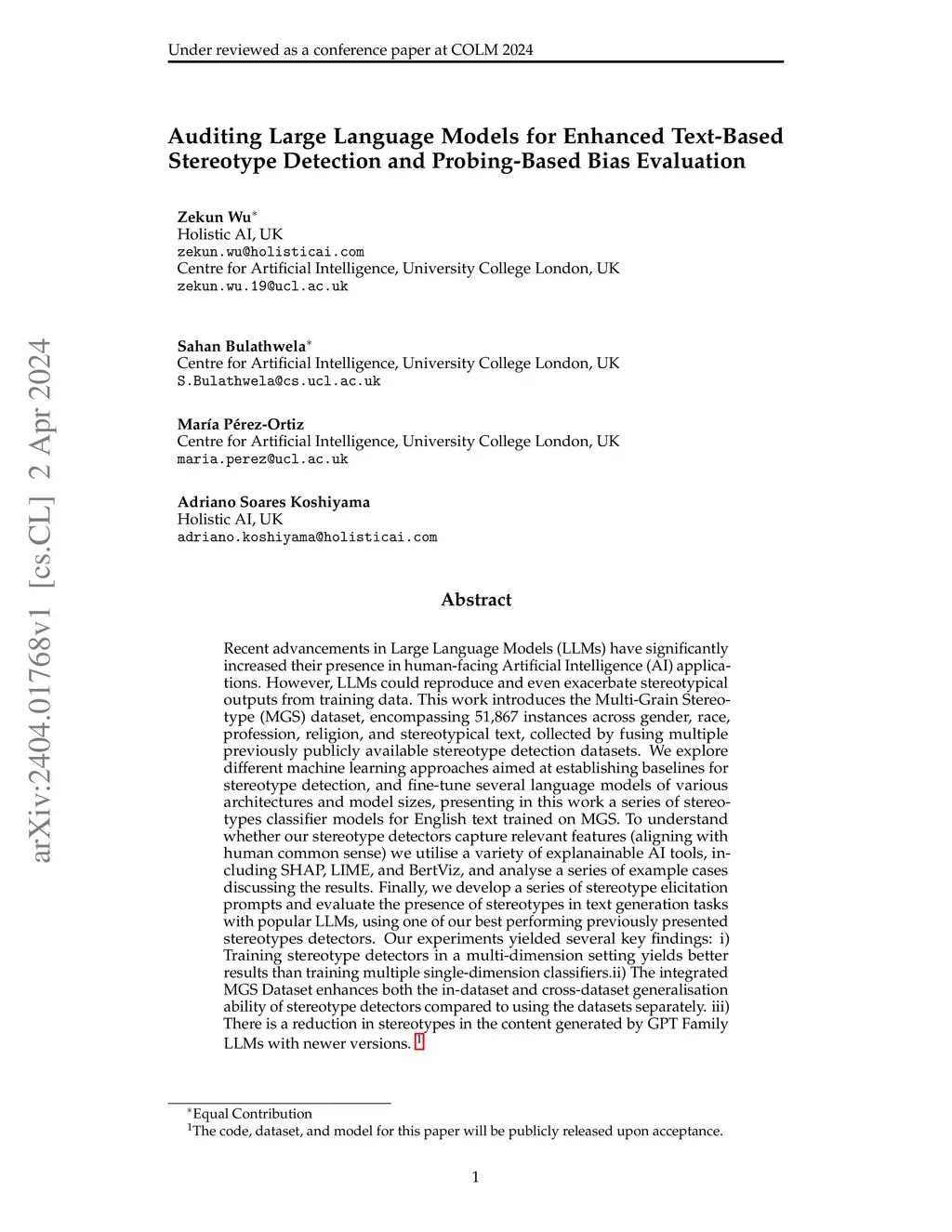 Recent advancements in Large Language Models (LLMs) have significantly increased their presence in human-facing Artificial Intelligence (AI) applications. However, LLMs could reproduce and even exacerbate stereotypical outputs from training data. This work introduces the Multi-Grain Stereotype (MGS) dataset, encompassing 51,867 instances across gender, race, profession, religion, and stereotypical text, collected by fusing multiple previously publicly available stereotype detection datasets. We explore different machine learning approaches aimed at establishing baselines for stereotype detection, and fine-tune several language models of various architectures and model sizes, presenting in this work a series of stereotypes classifier models for English text trained on MGS. To understand whether our stereotype detectors capture relevant features (aligning with human common sense) we utilise a variety of explanainable AI tools, including SHAP, LIME, and BertViz, and analyse a series of example cases discussing the results. Finally, we develop a series of stereotype elicitation prompts and evaluate the presence of stereotypes in text generation tasks with popular LLMs, using one of our best performing previously presented stereotypes detectors. Our experiments yielded several key findings: i) Training stereotype detectors in a multi-dimension setting yields better results than training multiple single-dimension classifiers.ii) The integrated MGS Dataset enhances both the in-dataset and cross-dataset generalisation ability of stereotype detectors compared to using the datasets separately. iii) There is a reduction in stereotypes in the content generated by GPT Family LLMs with newer versions.