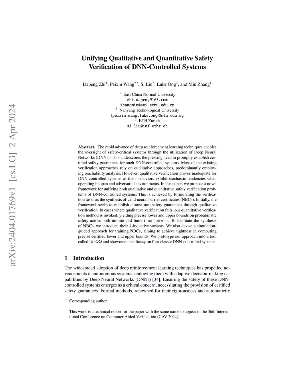The rapid advance of deep reinforcement learning techniques enables the oversight of safety-critical systems through the utilization of Deep Neural Networks (DNNs). This underscores the pressing need to promptly establish certified safety guarantees for such DNN-controlled systems. Most of the existing verification approaches rely on qualitative approaches, predominantly employing reachability analysis. However, qualitative verification proves inadequate for DNN-controlled systems as their behaviors exhibit stochastic tendencies when operating in open and adversarial environments. In this paper, we propose a novel framework for unifying both qualitative and quantitative safety verification problems of DNN-controlled systems. This is achieved by formulating the verification tasks as the synthesis of valid neural barrier certificates (NBCs). Initially, the framework seeks to establish almost-sure safety guarantees through qualitative verification. In cases where qualitative verification fails, our quantitative verification method is invoked, yielding precise lower and upper bounds on probabilistic safety across both infinite and finite time horizons. To facilitate the synthesis of NBCs, we introduce their -inductive variants. We also devise a simulation-guided approach for training NBCs, aiming to achieve tightness in computing precise certified lower and upper bounds. We prototype our approach into a tool called and showcase its efficacy on four classic DNN-controlled systems.
