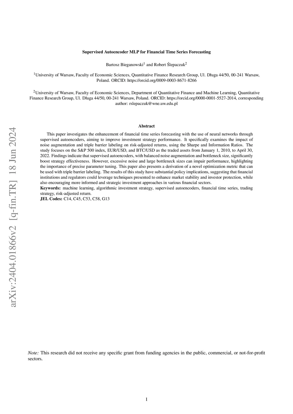 This paper investigates the enhancement of financial time series forecasting with the use of neural networks through supervised autoencoders, aiming to improve investment strategy performance. It specifically examines the impact of noise augmentation and triple barrier labeling on risk-adjusted returns, using the Sharpe and Information Ratios. The study focuses on the S&P 500 index, EUR/USD, and BTC/USD as the traded assets from January 1, 2010, to April 30, 2022. Findings indicate that supervised autoencoders, with balanced noise augmentation and bottleneck size, significantly boost strategy effectiveness. However, excessive noise and large bottleneck sizes can impair performance, highlighting the importance of precise parameter tuning. This paper also presents a derivation of a novel optimization metric that can be used with triple barrier labeling. The results of this study have substantial policy implications, suggesting that financial institutions and regulators could leverage techniques presented to enhance market stability and investor protection, while also encouraging more informed and strategic investment approaches in various financial sectors.