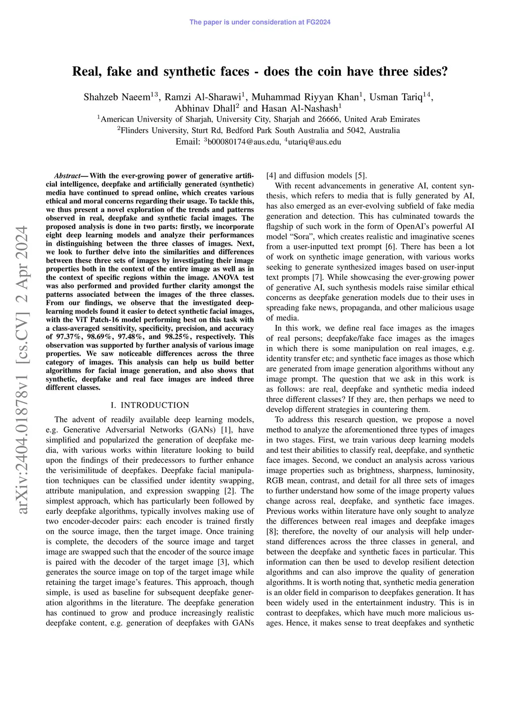 With the ever-growing power of generative artificial intelligence, deepfake and artificially generated (synthetic) media have continued to spread online, which creates various ethical and moral concerns regarding their usage. To tackle this, we thus present a novel exploration of the trends and patterns observed in real, deepfake and synthetic facial images. The proposed analysis is done in two parts: firstly, we incorporate eight deep learning models and analyze their performances in distinguishing between the three classes of images. Next, we look to further delve into the similarities and differences between these three sets of images by investigating their image properties both in the context of the entire image as well as in the context of specific regions within the image. ANOVA test was also performed and provided further clarity amongst the patterns associated between the images of the three classes. From our findings, we observe that the investigated deeplearning models found it easier to detect synthetic facial images, with the ViT Patch-16 model performing best on this task with a class-averaged sensitivity, specificity, precision, and accuracy of 97.37%, 98.69%, 97.48%, and 98.25%, respectively. This observation was supported by further analysis of various image properties. We saw noticeable differences across the three category of images. This analysis can help us build better algorithms for facial image generation, and also shows that synthetic, deepfake and real face images are indeed three different classes.