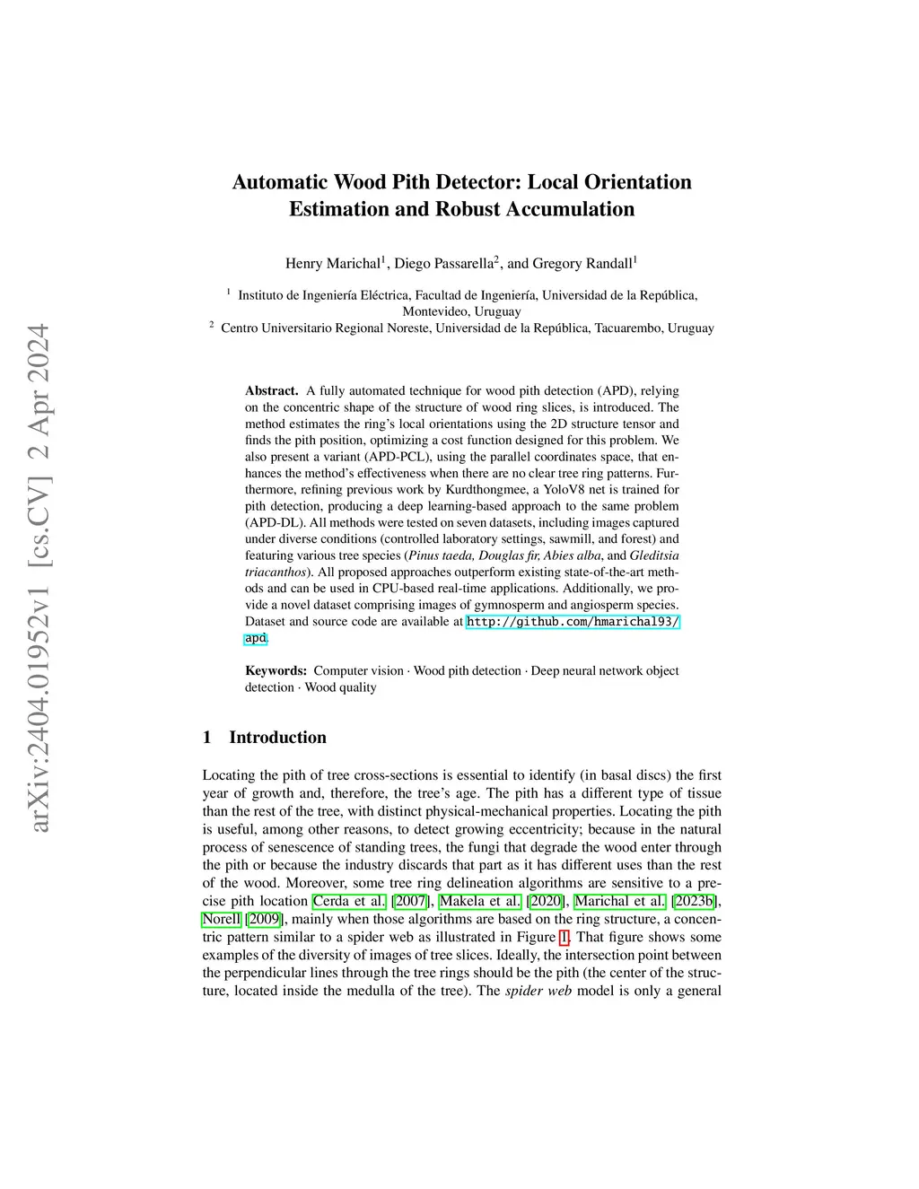 A fully automated technique for wood pith detection (APD), relying on the concentric shape of the structure of wood ring slices, is introduced. The method estimates the ring's local orientations using the 2D structure tensor and finds the pith position, optimizing a cost function designed for this problem. We also present a variant (APD-PCL), using the parallel coordinates space, that enhances the method's effectiveness when there are no clear tree ring patterns. Furthermore, refining previous work by Kurdthongmee, a YoloV8 net is trained for pith detection, producing a deep learning-based approach to the same problem (APD-DL). All methods were tested on seven datasets, including images captured under diverse conditions (controlled laboratory settings, sawmill, and forest) and featuring various tree species (Pinus taeda, Douglas fir, Abies alba, and Gleditsia triacanthos). All proposed approaches outperform existing state-of-the-art methods and can be used in CPU-based real-time applications. Additionally, we provide a novel dataset comprising images of gymnosperm and angiosperm species. Dataset and source code are available at http://github.com/hmarichal93/apd.