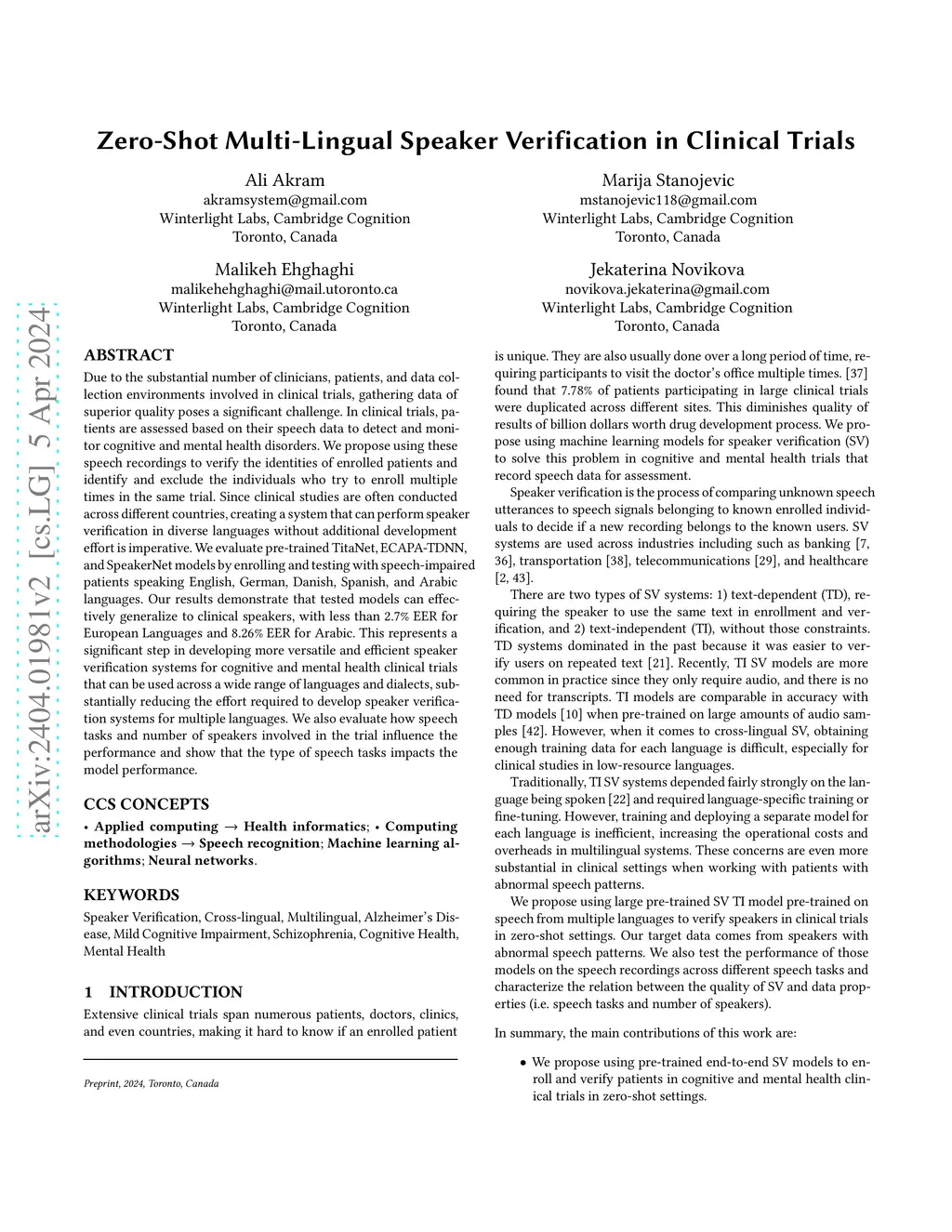 Zero-Shot Multi-Lingual Speaker Verification in Clinical Trials