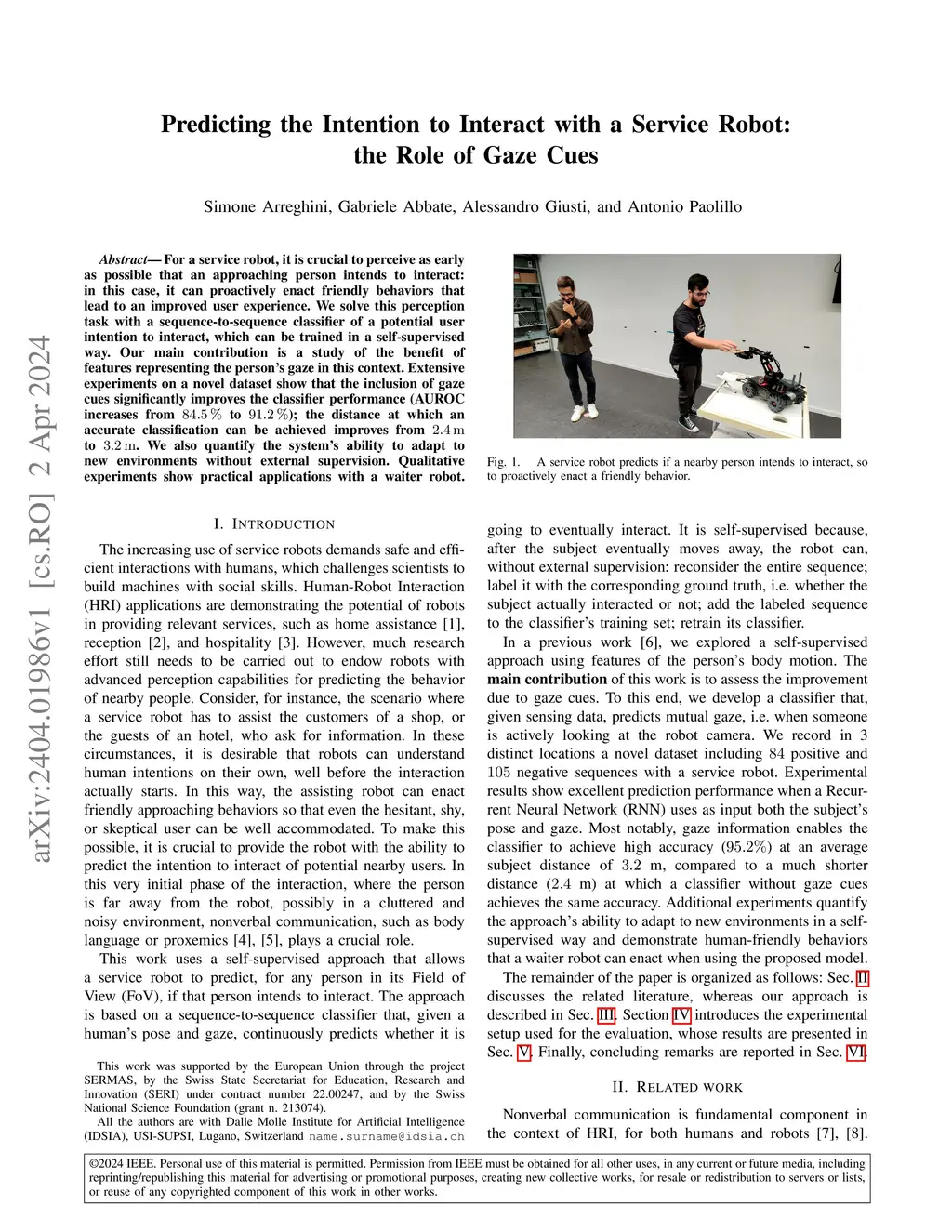 For a service robot, it is crucial to perceive as early as possible that an approaching person intends to interact: in this case, it can proactively enact friendly behaviors that lead to an improved user experience. We solve this perception task with a sequence-to-sequence classifier of a potential user intention to interact, which can be trained in a self-supervised way. Our main contribution is a study of the benefit of features representing the person's gaze in this context. Extensive experiments on a novel dataset show that the inclusion of gaze cues significantly improves the classifier performance (AUROC increases from 84.5% to 91.2%); the distance at which an accurate classification can be achieved improves from 2.4 m to 3.2 m. We also quantify the system's ability to adapt to new environments without external supervision. Qualitative experiments show practical applications with a waiter robot.