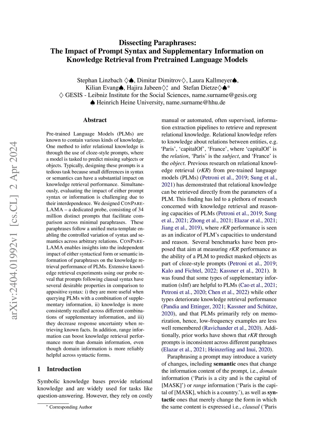 Pre-trained Language Models (PLMs) are known to contain various kinds of knowledge. One method to infer relational knowledge is through the use of cloze-style prompts, where a model is tasked to predict missing subjects or objects. Typically, designing these prompts is a tedious task because small differences in syntax or semantics can have a substantial impact on knowledge retrieval performance. Simultaneously, evaluating the impact of either prompt syntax or information is challenging due to their interdependence. We designed CONPARE-LAMA - a dedicated probe, consisting of 34 million distinct prompts that facilitate comparison across minimal paraphrases. These paraphrases follow a unified meta-template enabling the controlled variation of syntax and semantics across arbitrary relations. CONPARE-LAMA enables insights into the independent impact of either syntactical form or semantic information of paraphrases on the knowledge retrieval performance of PLMs. Extensive knowledge retrieval experiments using our probe reveal that prompts following clausal syntax have several desirable properties in comparison to appositive syntax: i) they are more useful when querying PLMs with a combination of supplementary information, ii) knowledge is more consistently recalled across different combinations of supplementary information, and iii) they decrease response uncertainty when retrieving known facts. In addition, range information can boost knowledge retrieval performance more than domain information, even though domain information is more reliably helpful across syntactic forms.