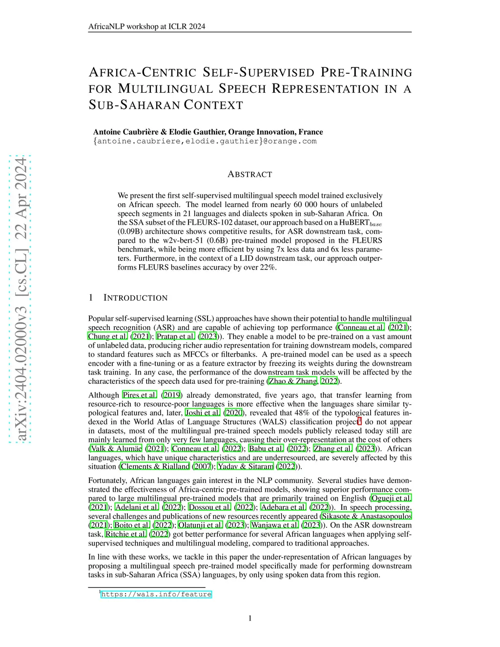We present the first self-supervised multilingual speech model trained exclusively on African speech. The model learned from nearly 60 000 hours of unlabeled speech segments in 21 languages and dialects spoken in sub-Saharan Africa. On the SSA subset of the FLEURS-102 dataset, our approach based on a HuBERT (0.09B) architecture shows competitive results, for ASR downstream task, compared to the w2v-bert-51 (0.6B) pre-trained model proposed in the FLEURS benchmark, while being more efficient by using 7x less data and 6x less parameters. Furthermore, in the context of a LID downstream task, our approach outperforms FLEURS baselines accuracy by over 22\%.