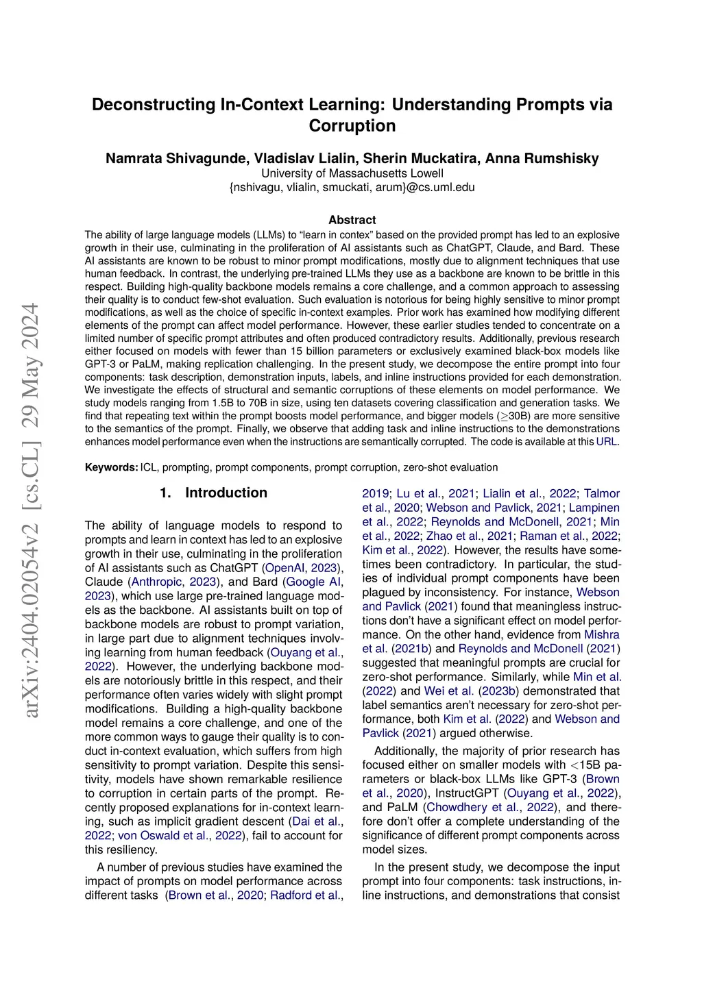 The ability of large language models (LLMs) to learn in context based on the provided prompt has led to an explosive growth in their use, culminating in the proliferation of AI assistants such as ChatGPT, Claude, and Bard. These AI assistants are known to be robust to minor prompt modifications, mostly due to alignment techniques that use human feedback. In contrast, the underlying pre-trained LLMs they use as a backbone are known to be brittle in this respect. Building high-quality backbone models remains a core challenge, and a common approach to assessing their quality is to conduct few-shot evaluation. Such evaluation is notorious for being highly sensitive to minor prompt modifications, as well as the choice of specific in-context examples. Prior work has examined how modifying different elements of the prompt can affect model performance. However, these earlier studies tended to concentrate on a limited number of specific prompt attributes and often produced contradictory results. Additionally, previous research either focused on models with fewer than 15 billion parameters or exclusively examined black-box models like GPT-3 or PaLM, making replication challenging. In the present study, we decompose the entire prompt into four components: task description, demonstration inputs, labels, and inline instructions provided for each demonstration. We investigate the effects of structural and semantic corruptions of these elements on model performance. We study models ranging from 1.5B to 70B in size, using ten datasets covering classification and generation tasks. We find that repeating text within the prompt boosts model performance, and bigger models (30B) are more sensitive to the semantics of the prompt. Finally, we observe that adding task and inline instructions to the demonstrations enhances model performance even when the instructions are semantically corrupted.