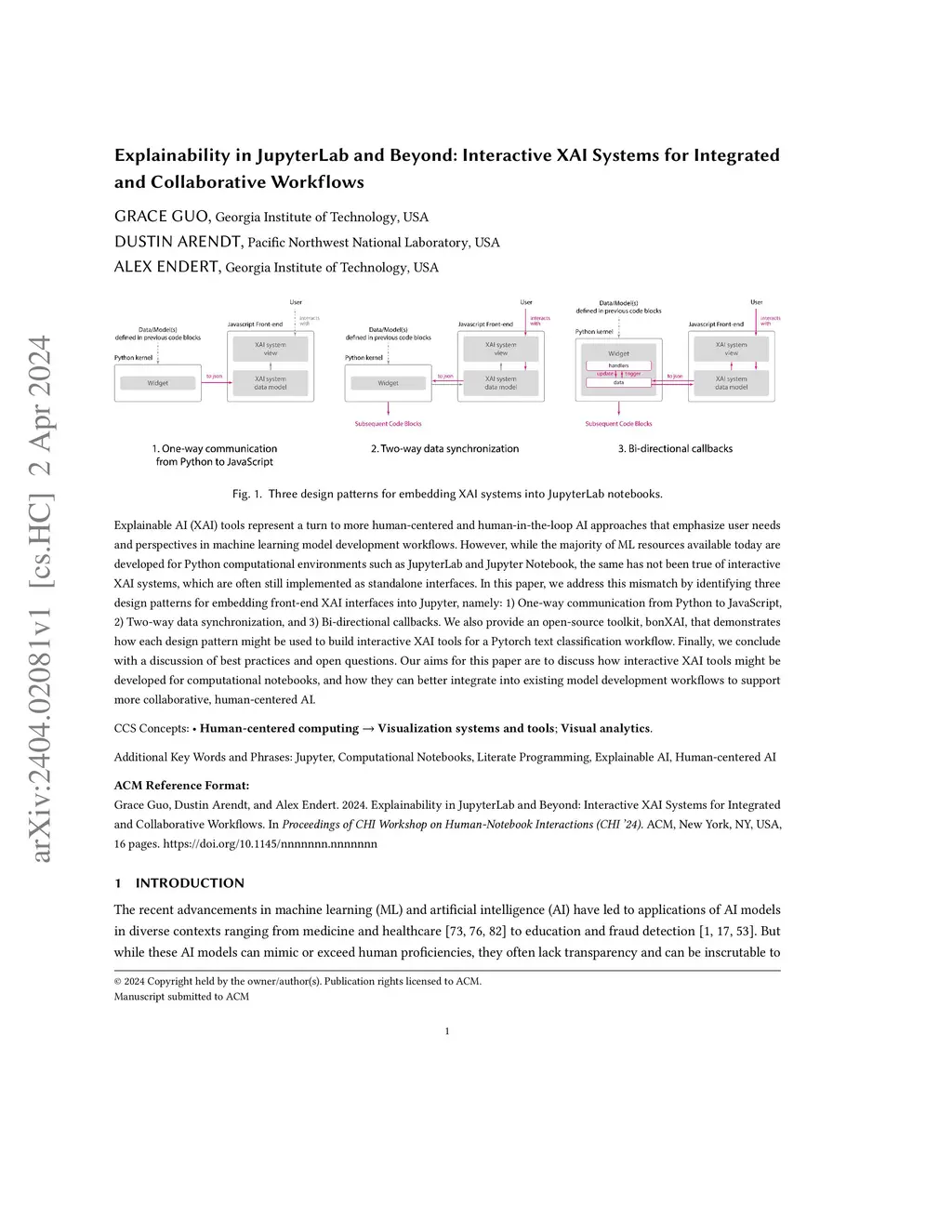 Explainable AI (XAI) tools represent a turn to more human-centered and human-in-the-loop AI approaches that emphasize user needs and perspectives in machine learning model development workflows. However, while the majority of ML resources available today are developed for Python computational environments such as JupyterLab and Jupyter Notebook, the same has not been true of interactive XAI systems, which are often still implemented as standalone interfaces. In this paper, we address this mismatch by identifying three design patterns for embedding front-end XAI interfaces into Jupyter, namely: 1) One-way communication from Python to JavaScript, 2) Two-way data synchronization, and 3) Bi-directional callbacks. We also provide an open-source toolkit, bonXAI, that demonstrates how each design pattern might be used to build interactive XAI tools for a Pytorch text classification workflow. Finally, we conclude with a discussion of best practices and open questions. Our aims for this paper are to discuss how interactive XAI tools might be developed for computational notebooks, and how they can better integrate into existing model development workflows to support more collaborative, human-centered AI.