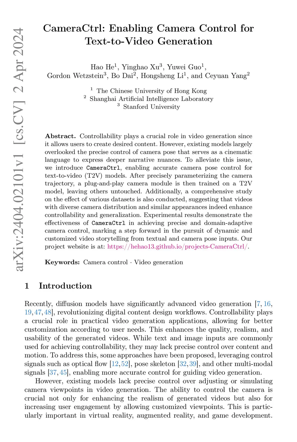 Controllability plays a crucial role in video generation, as it allows users to create and edit content more precisely. Existing models, however, lack control of camera pose that serves as a cinematic language to express deeper narrative nuances. To alleviate this issue, we introduce CameraCtrl, enabling accurate camera pose control for video diffusion models. Our approach explores effective camera trajectory parameterization along with a plug-and-play camera pose control module that is trained on top of a video diffusion model, leaving other modules of the base model untouched. Moreover, a comprehensive study on the effect of various training datasets is conducted, suggesting that videos with diverse camera distributions and similar appearance to the base model indeed enhance controllability and generalization. Experimental results demonstrate the effectiveness of CameraCtrl in achieving precise camera control with different video generation models, marking a step forward in the pursuit of dynamic and customized video storytelling from textual and camera pose inputs.